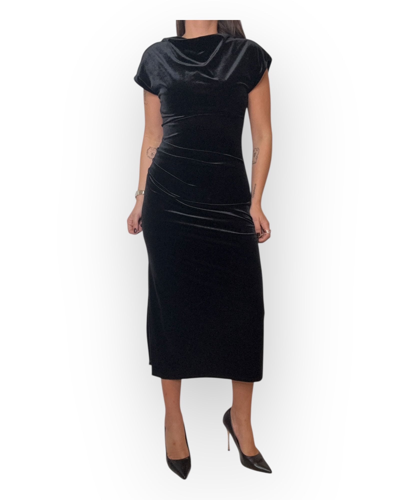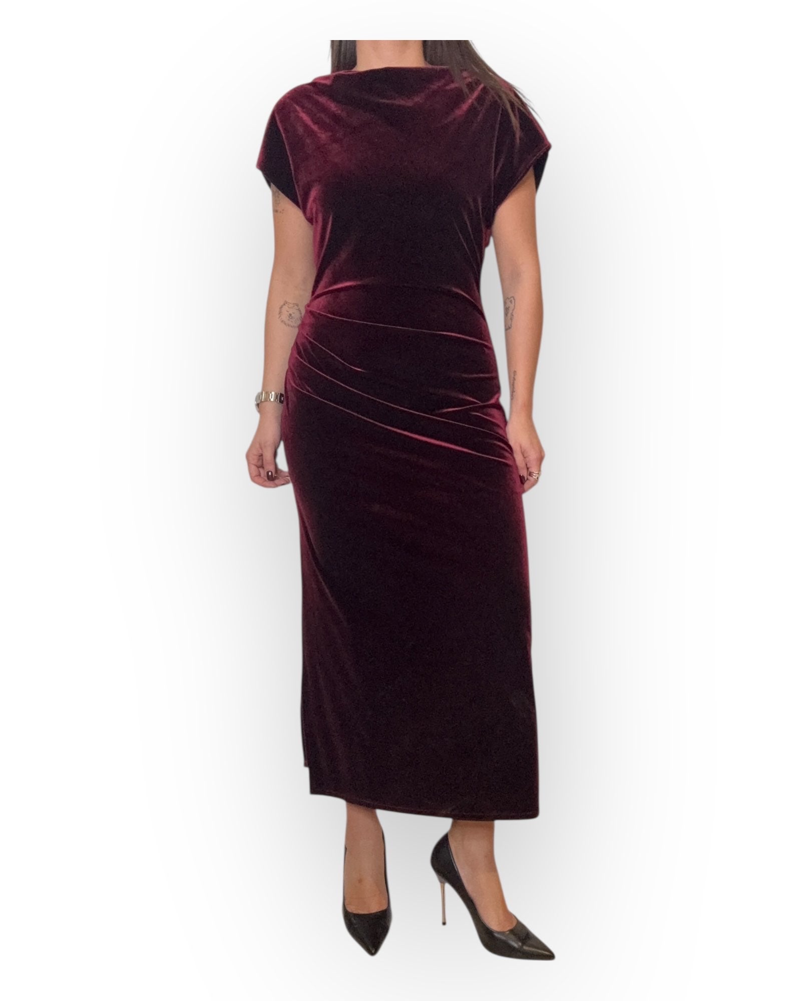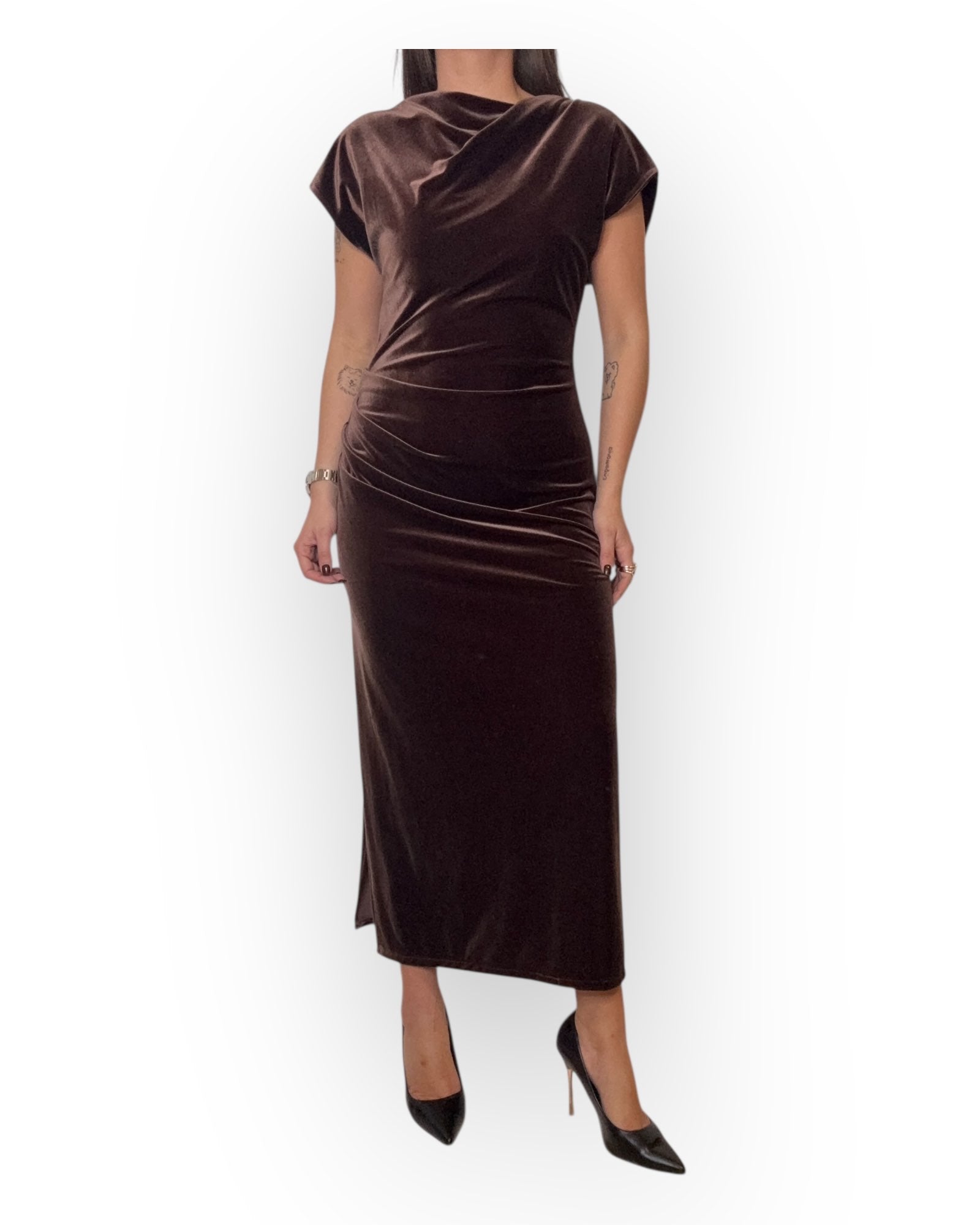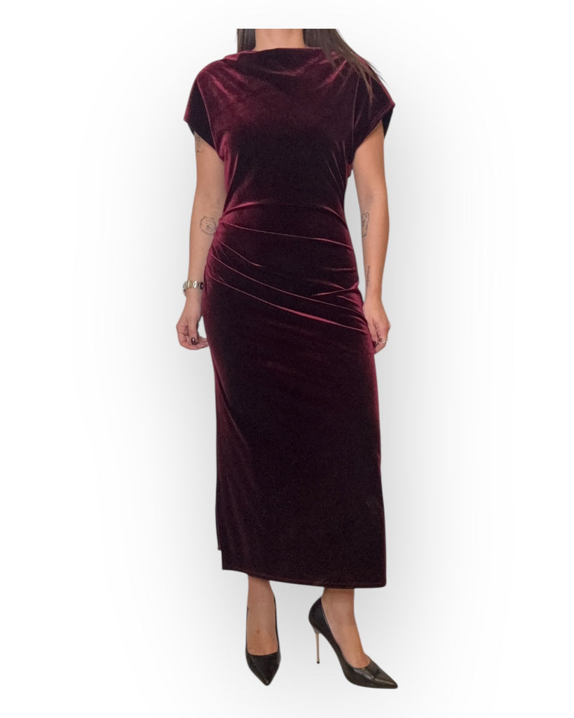 ABITO LUNGO CON DRAPPEGGIO SUL FIANCO , E ZIP SUL RETRO.