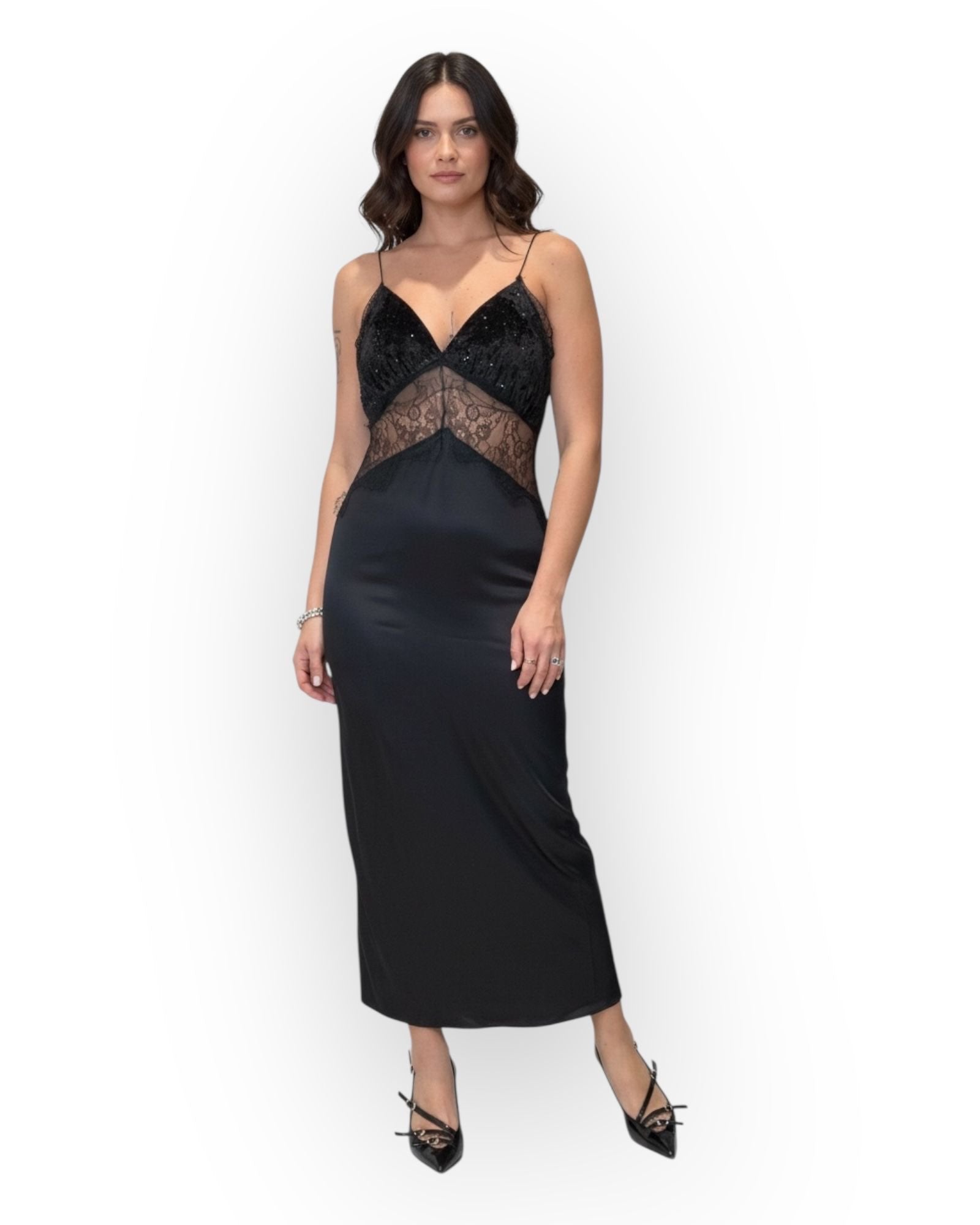 ABITO LUNGO VICOLO CON BRETELLE SOTTILI E DETTAGLI IN PIZZO,VELLUTO LISCIO E STRASS TONO SU TONO