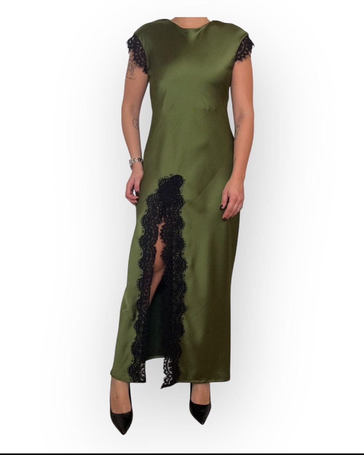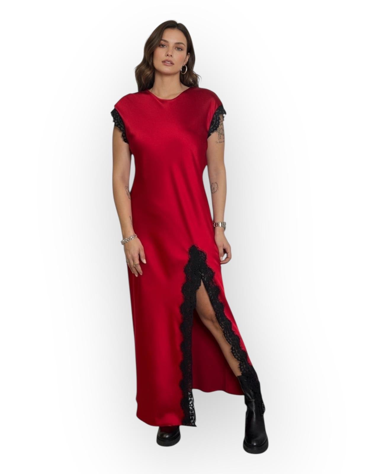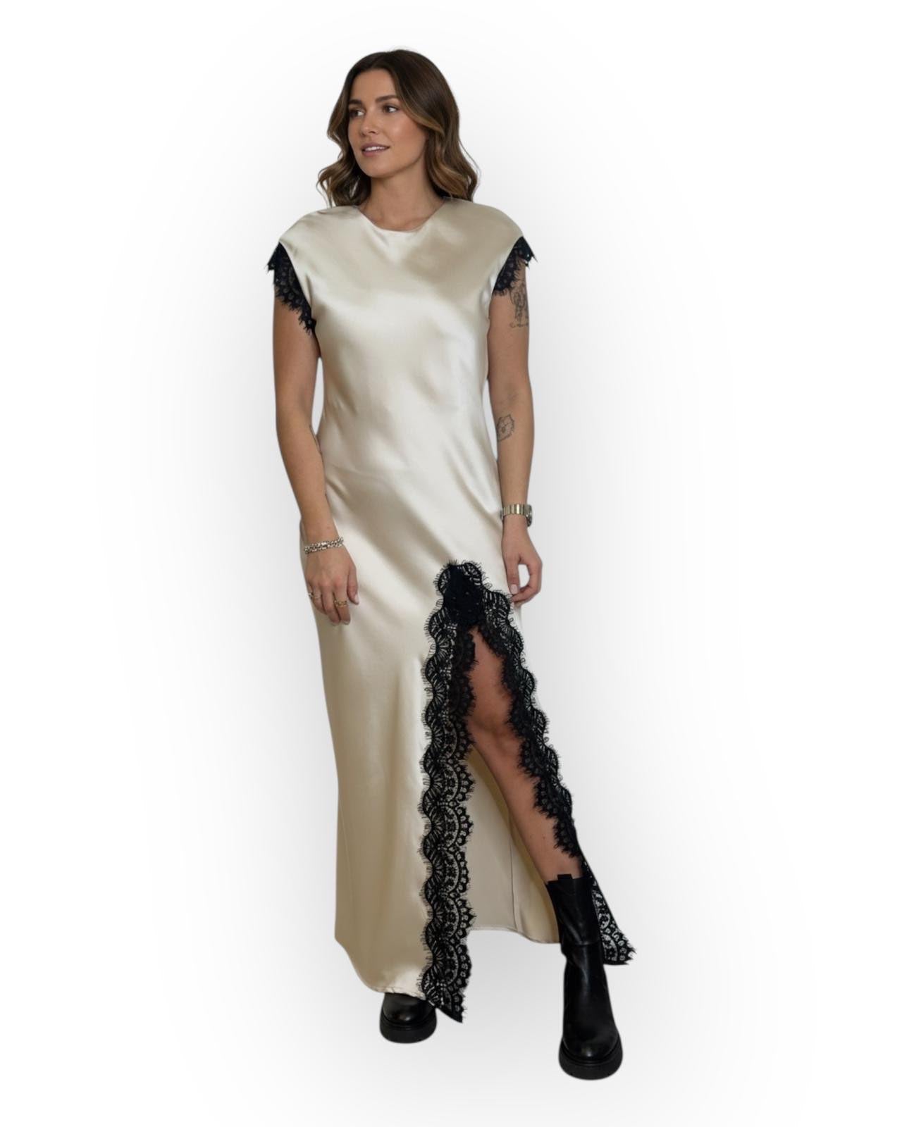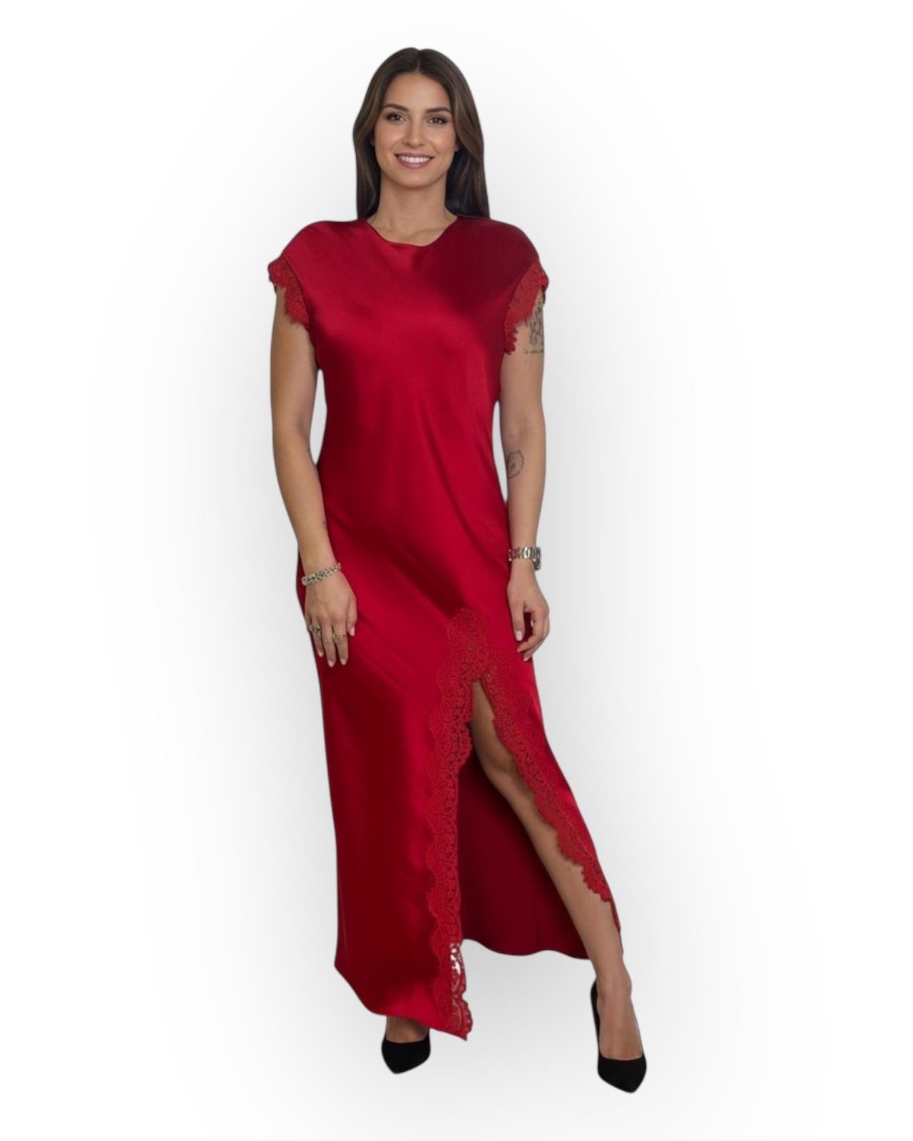 ABITO LUNGO IN VISCOSA CON SPACCO IN PIZZO E SULLE MANICHE.
