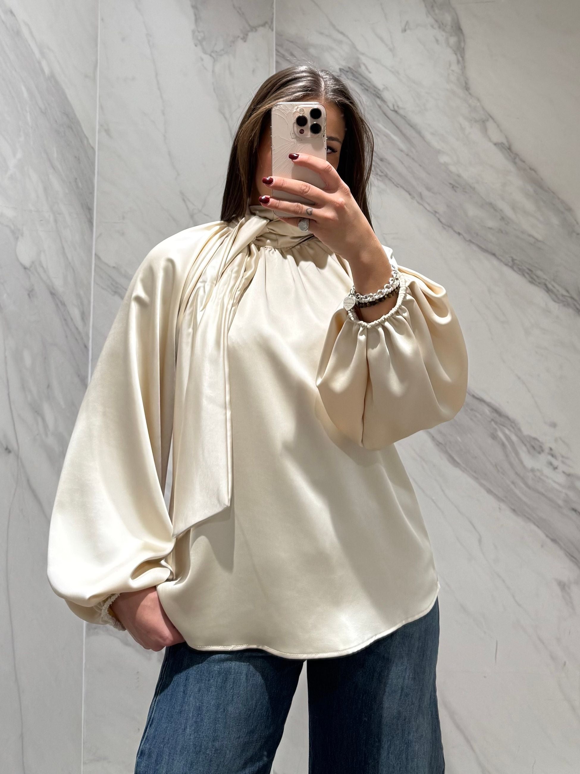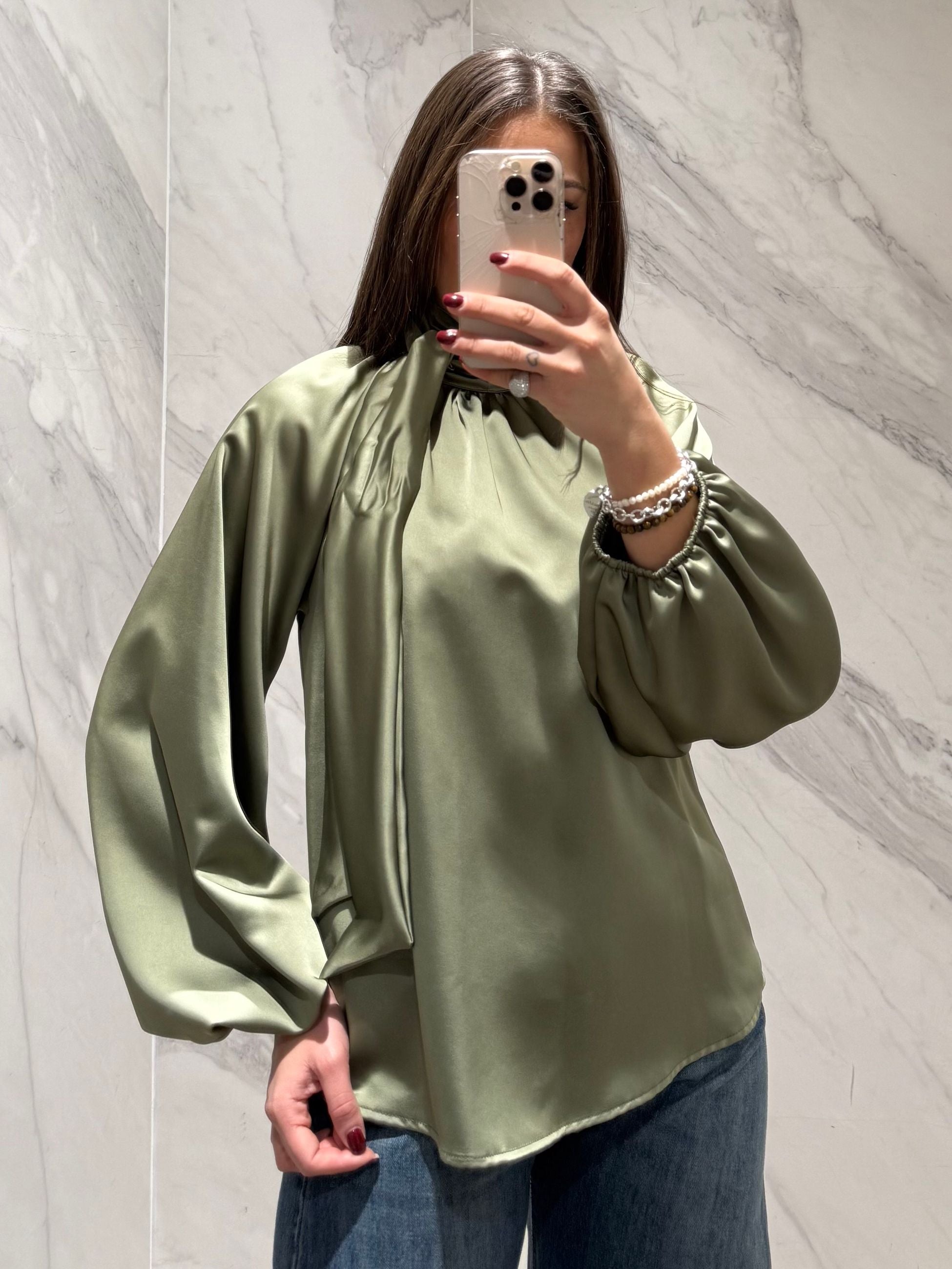 BLUSA SATIN TENSIONE IN CON COLLETTO COREANA E CHIUSURA CON NASTRO SUL RETRO