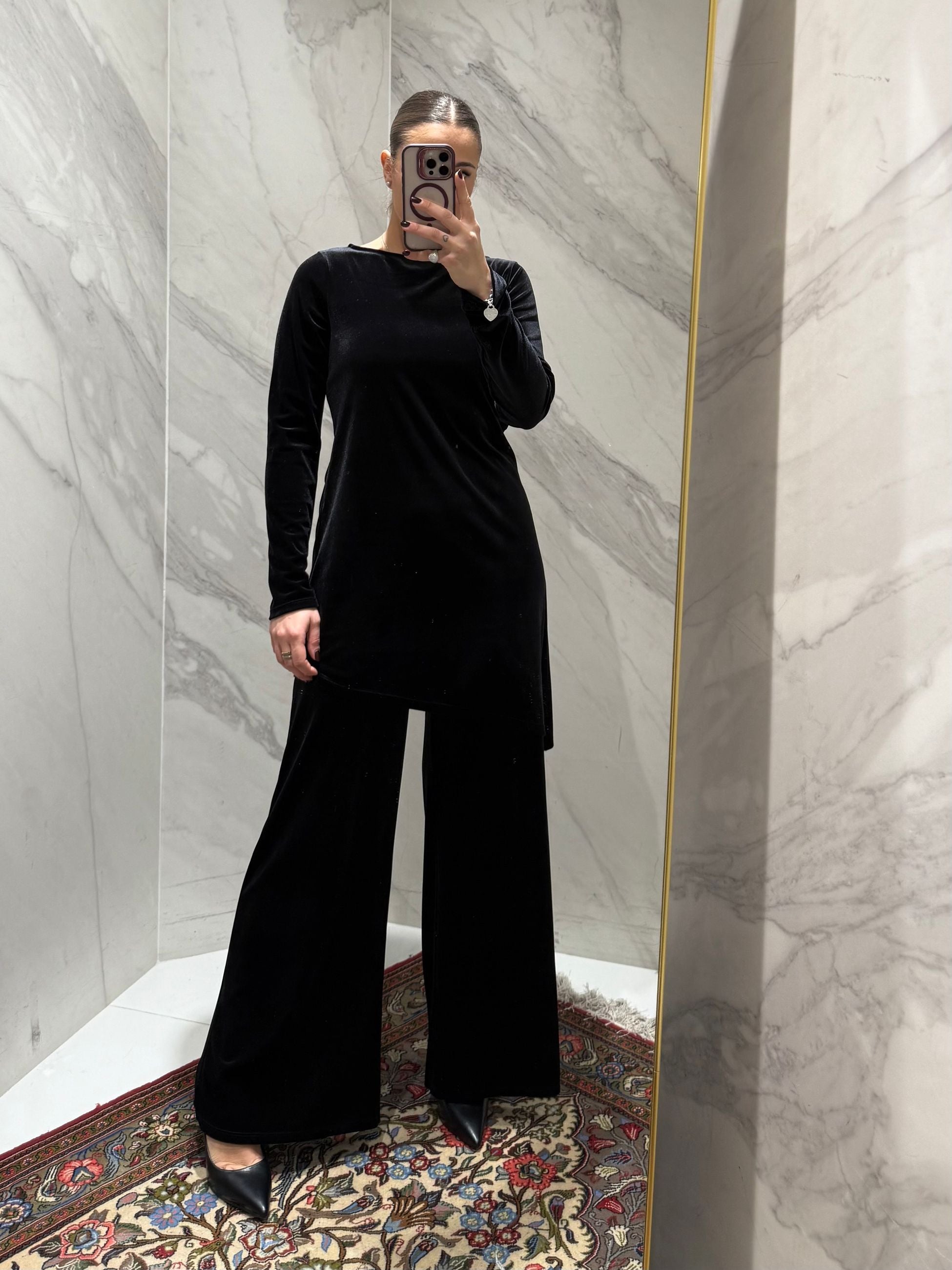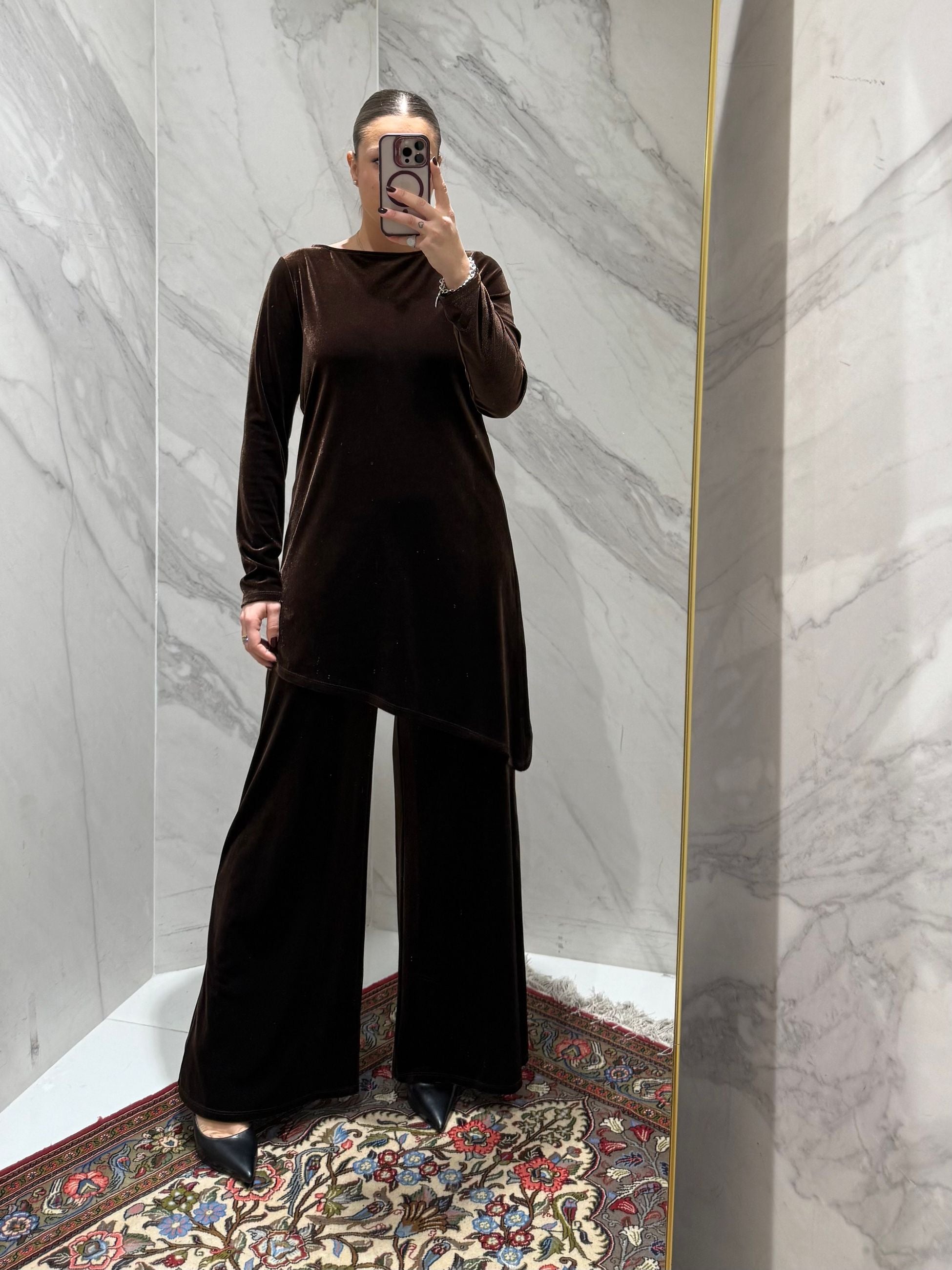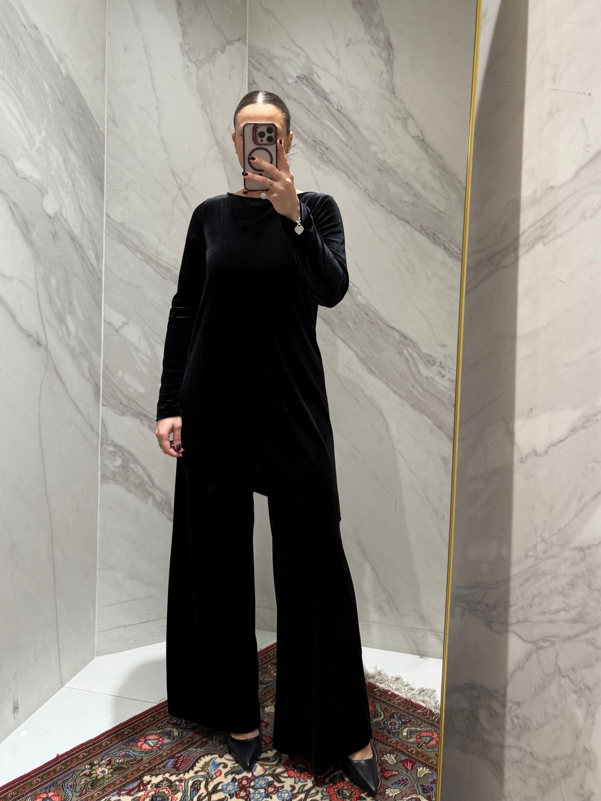 COMPLETO TENSIONE IN IN CINIGLIA CON MAGLIA LUNGA CON TAGLIO ASIMMETRICO E PANTALONE A GAMBA DRITTA