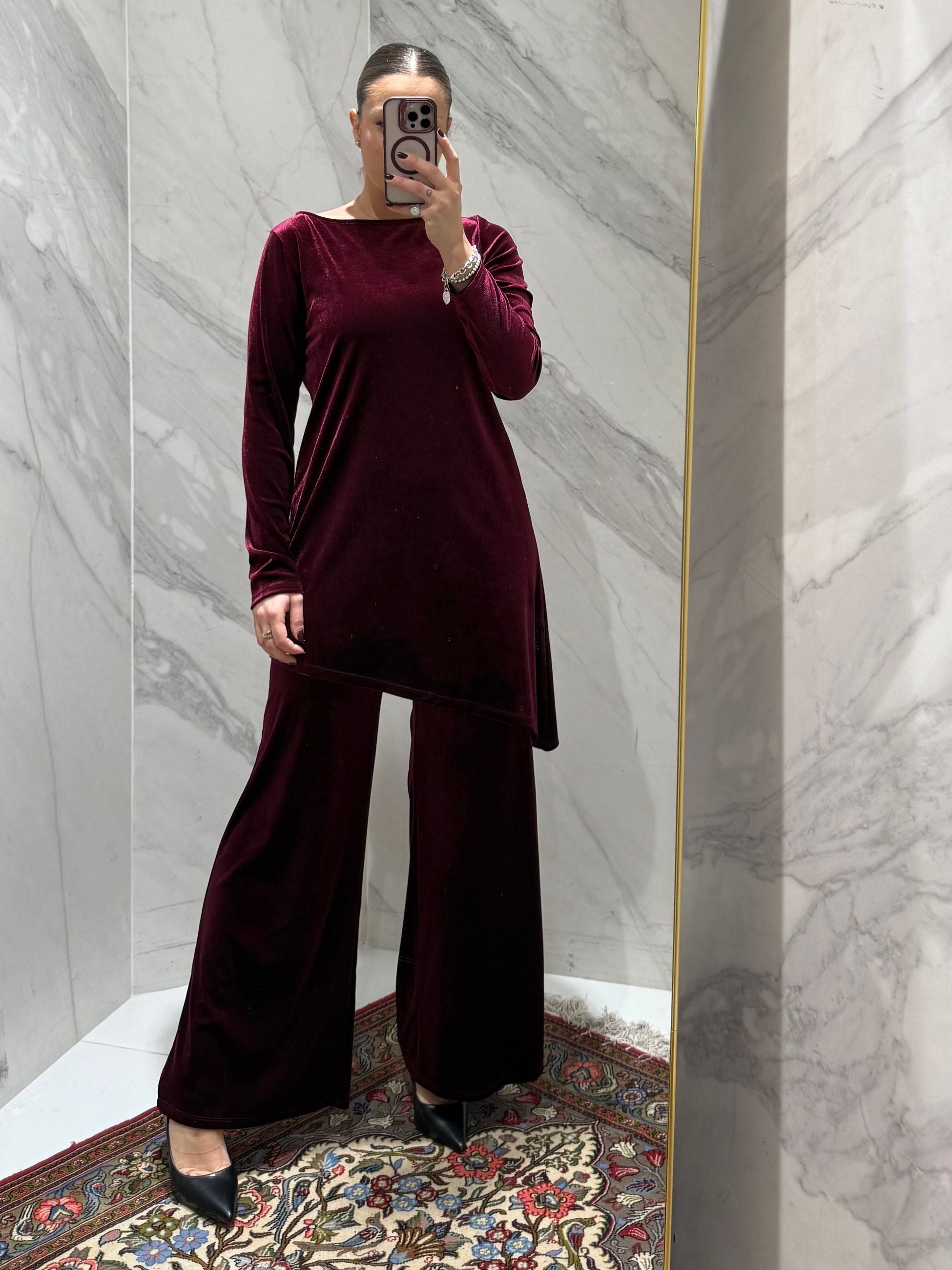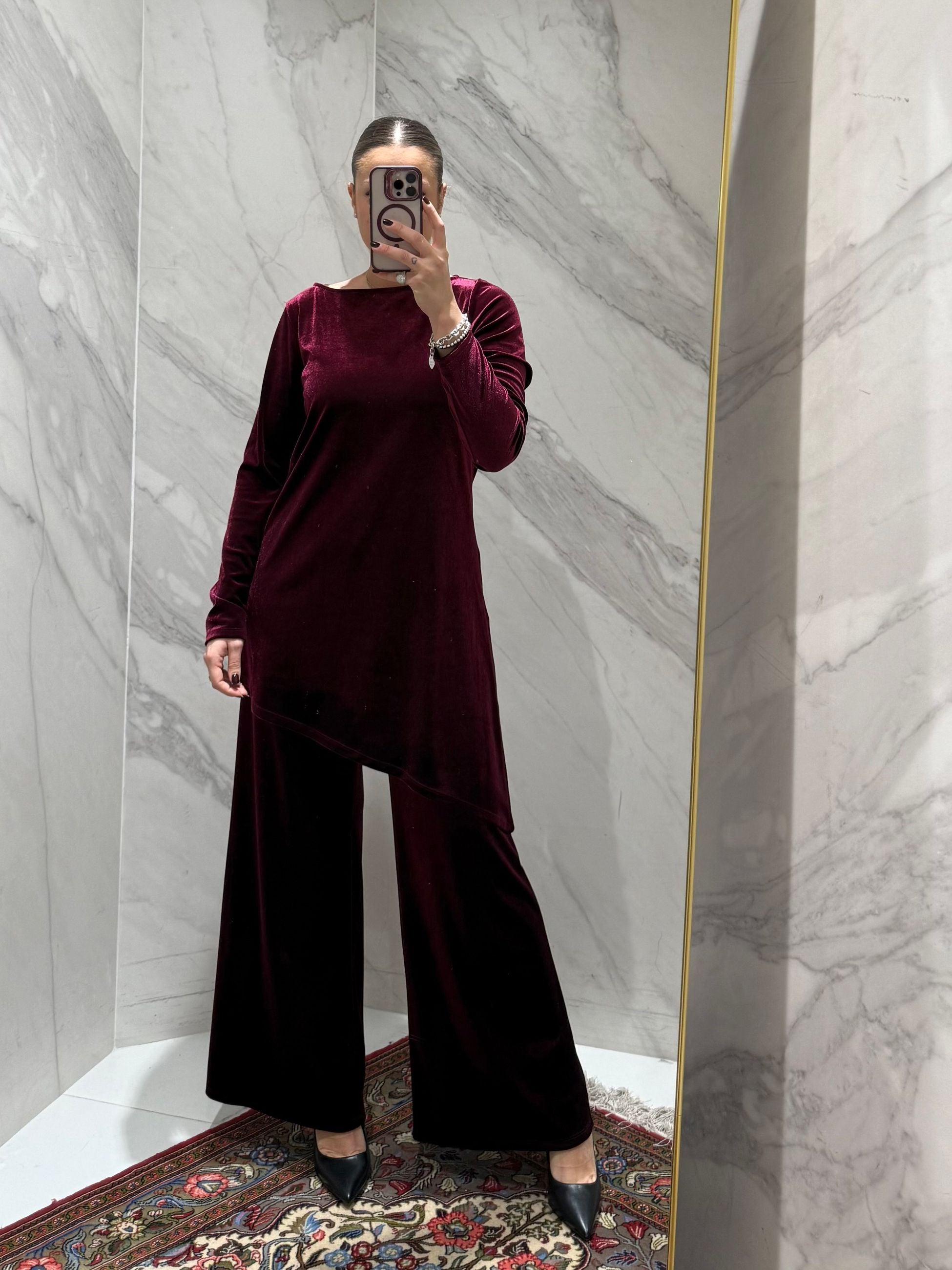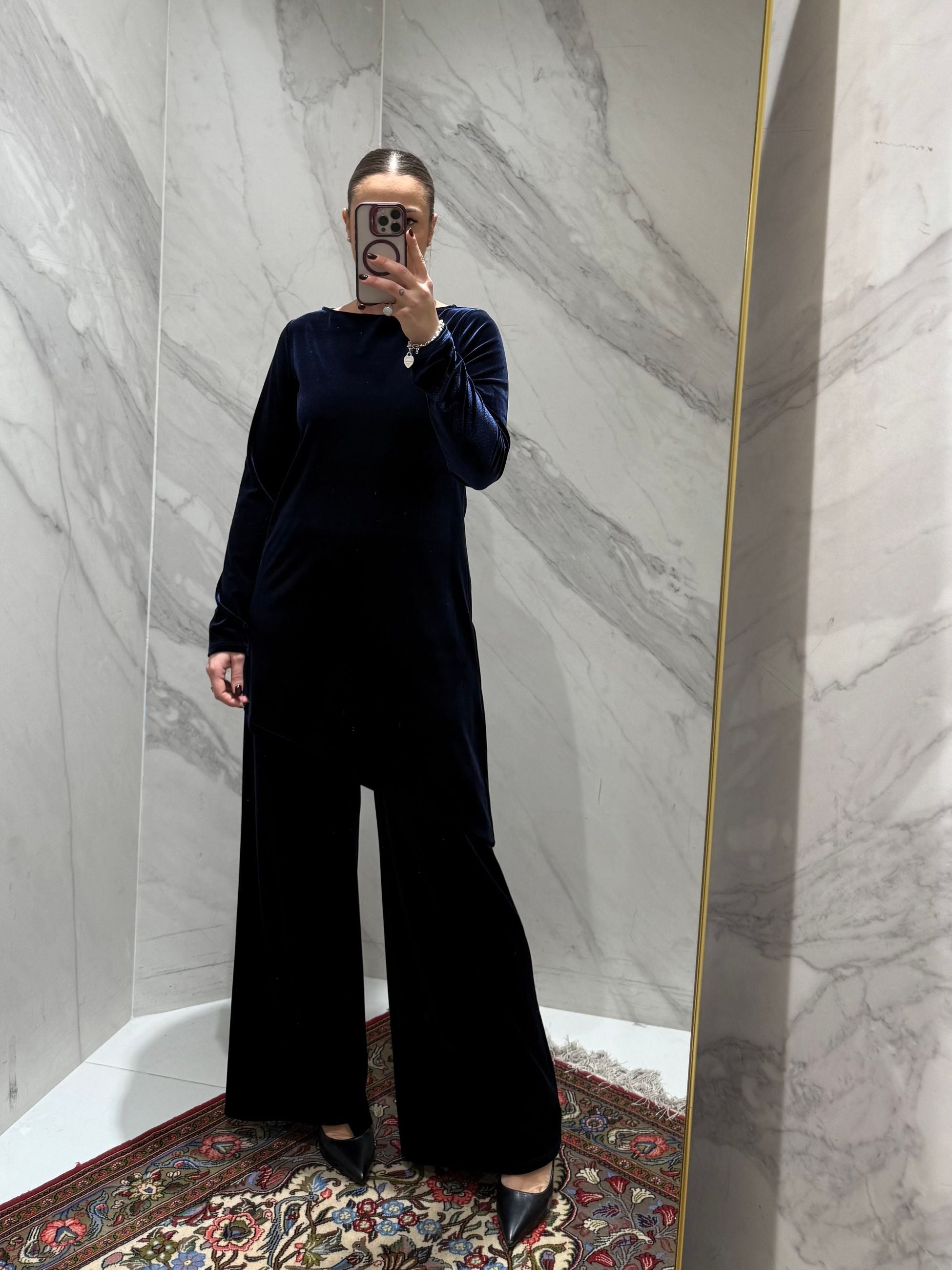 COMPLETO TENSIONE IN IN CINIGLIA CON MAGLIA LUNGA CON TAGLIO ASIMMETRICO E PANTALONE A GAMBA DRITTA