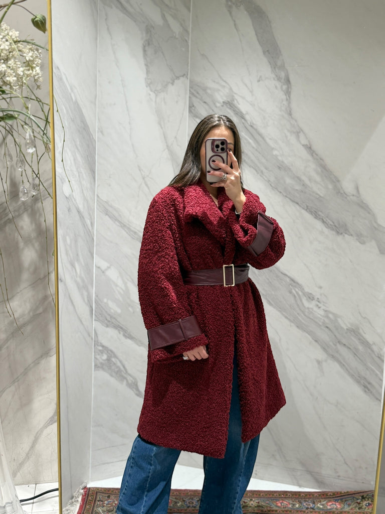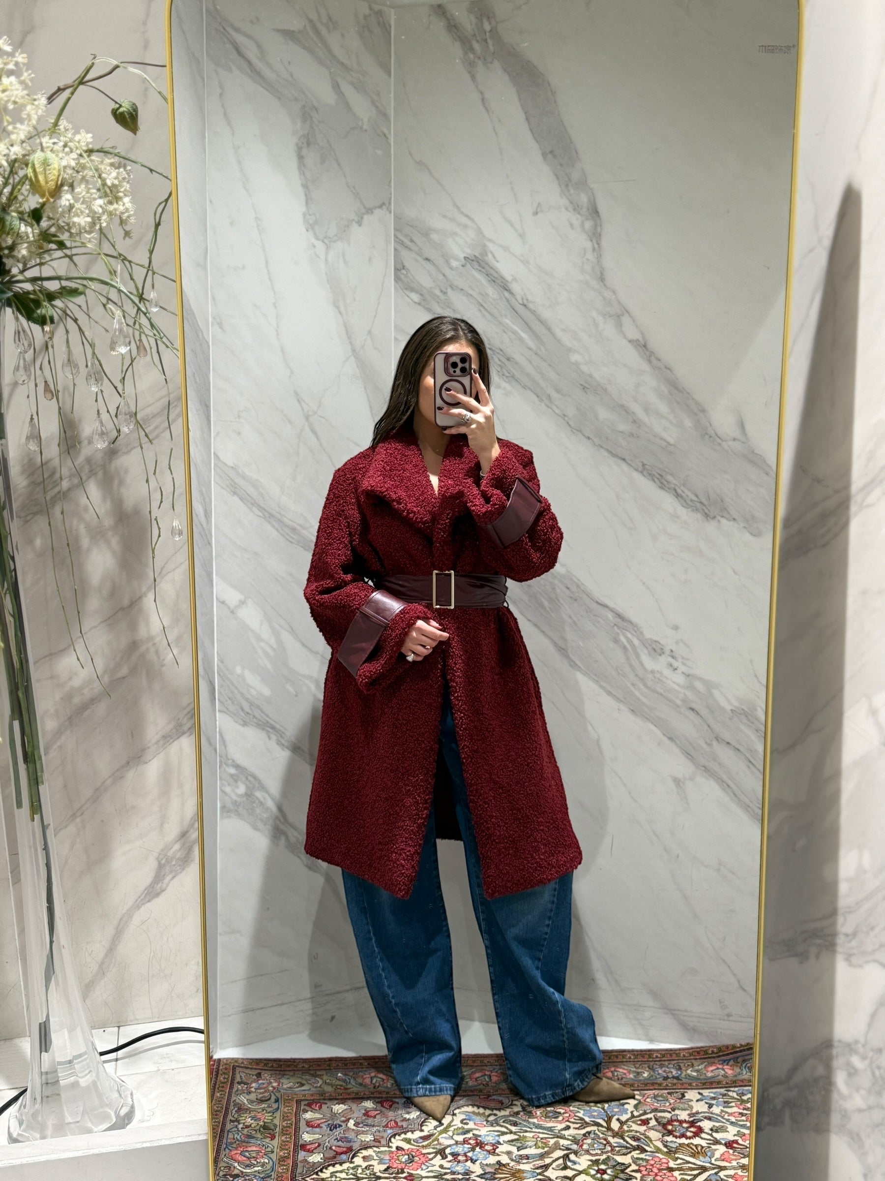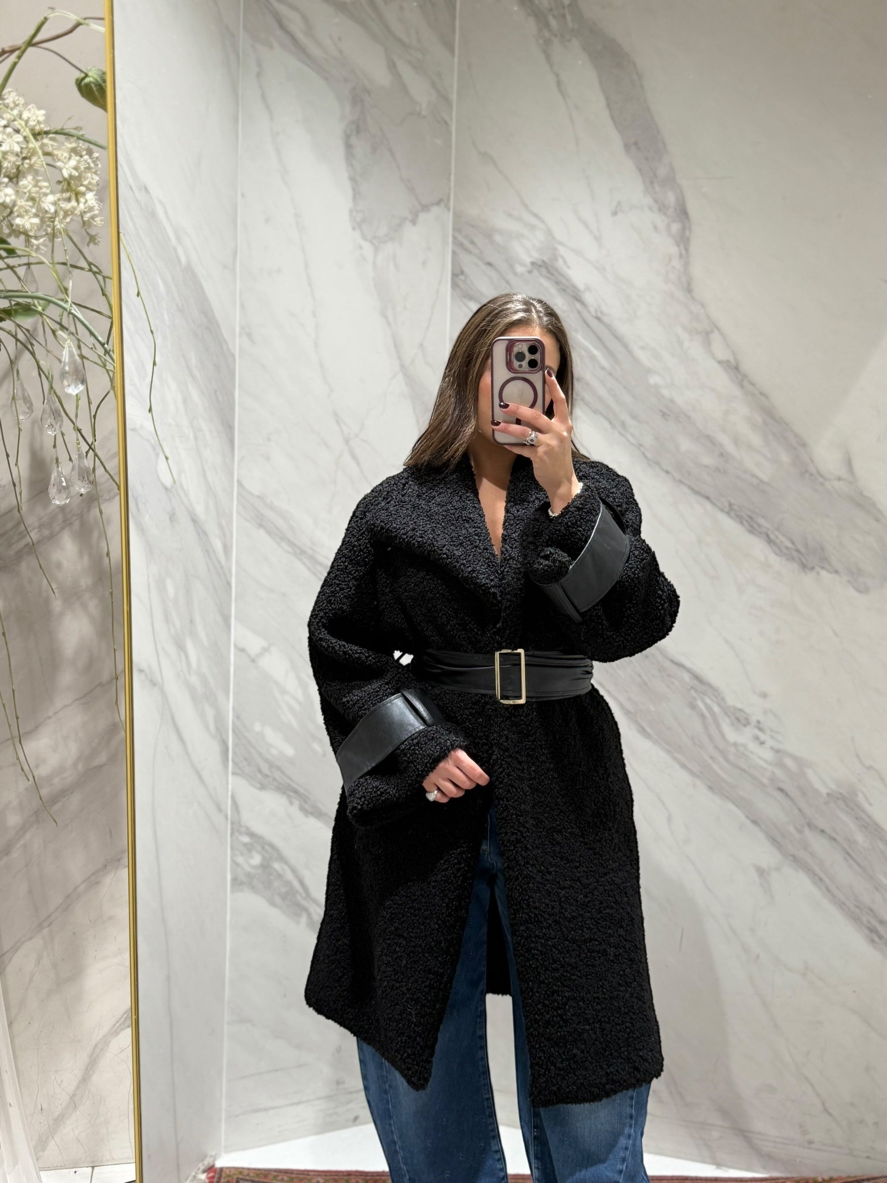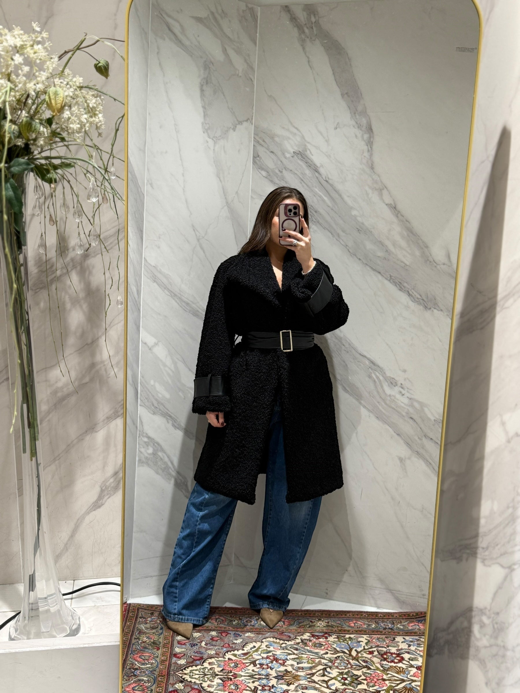 CAPPOTTO MODELLO TEDDY CON CINTURA IN PELLE E INSERTI SULLA MANICA IN PELLE.