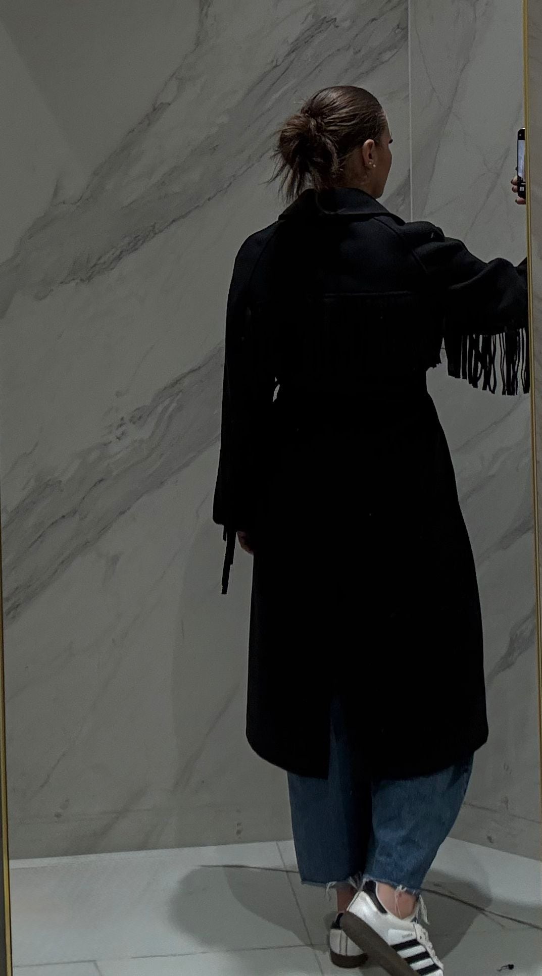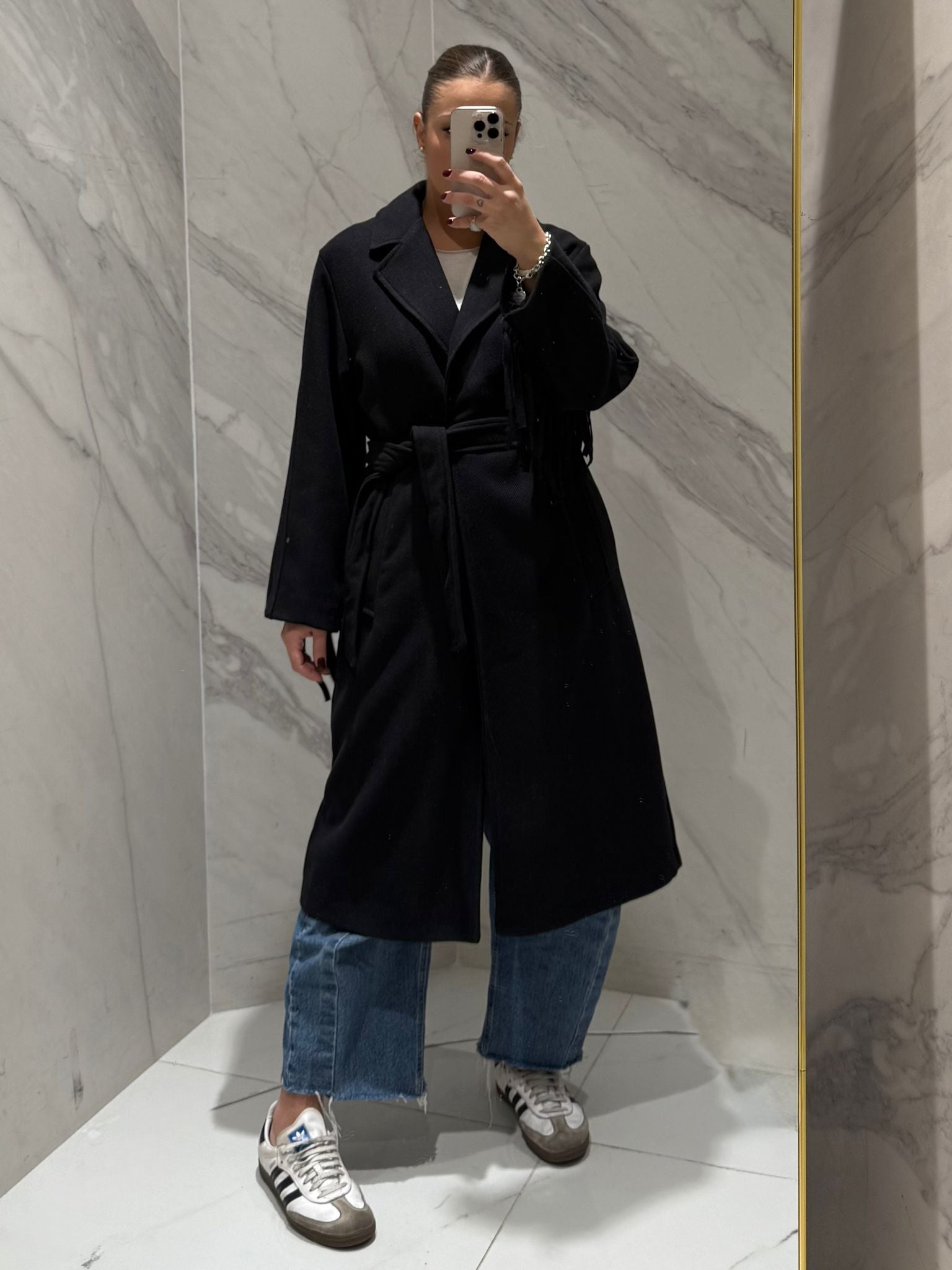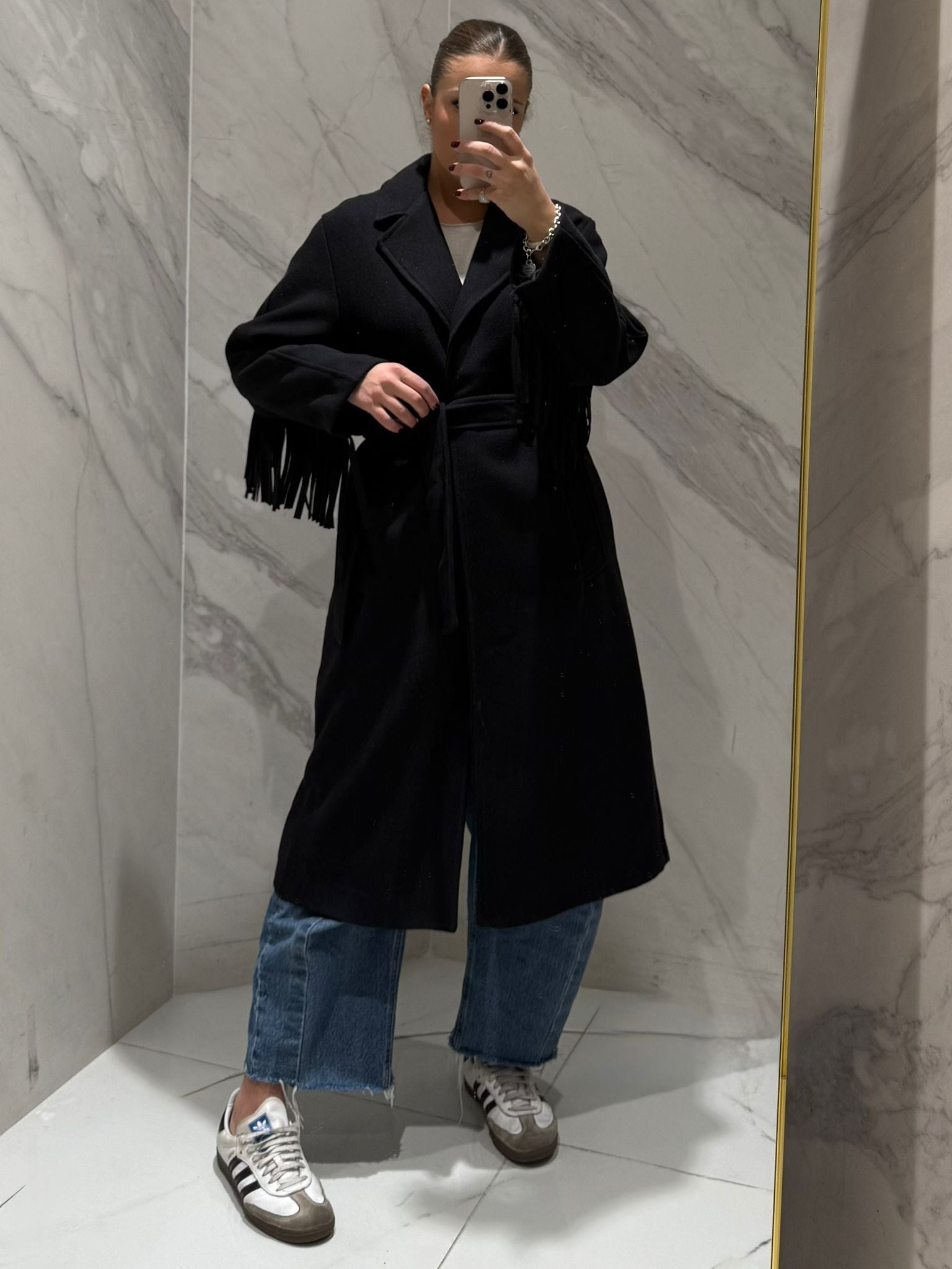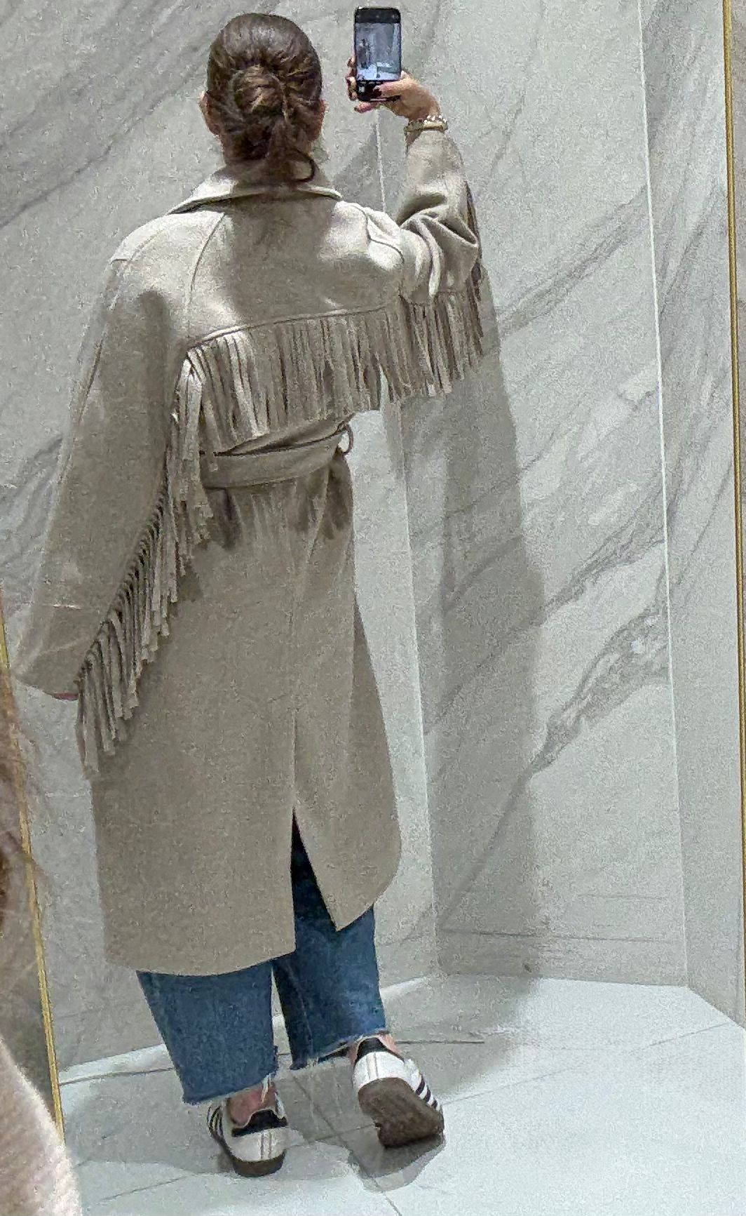 CAPPOTTO LUNGO CON FRANGE CON CINTURA IN VITA.