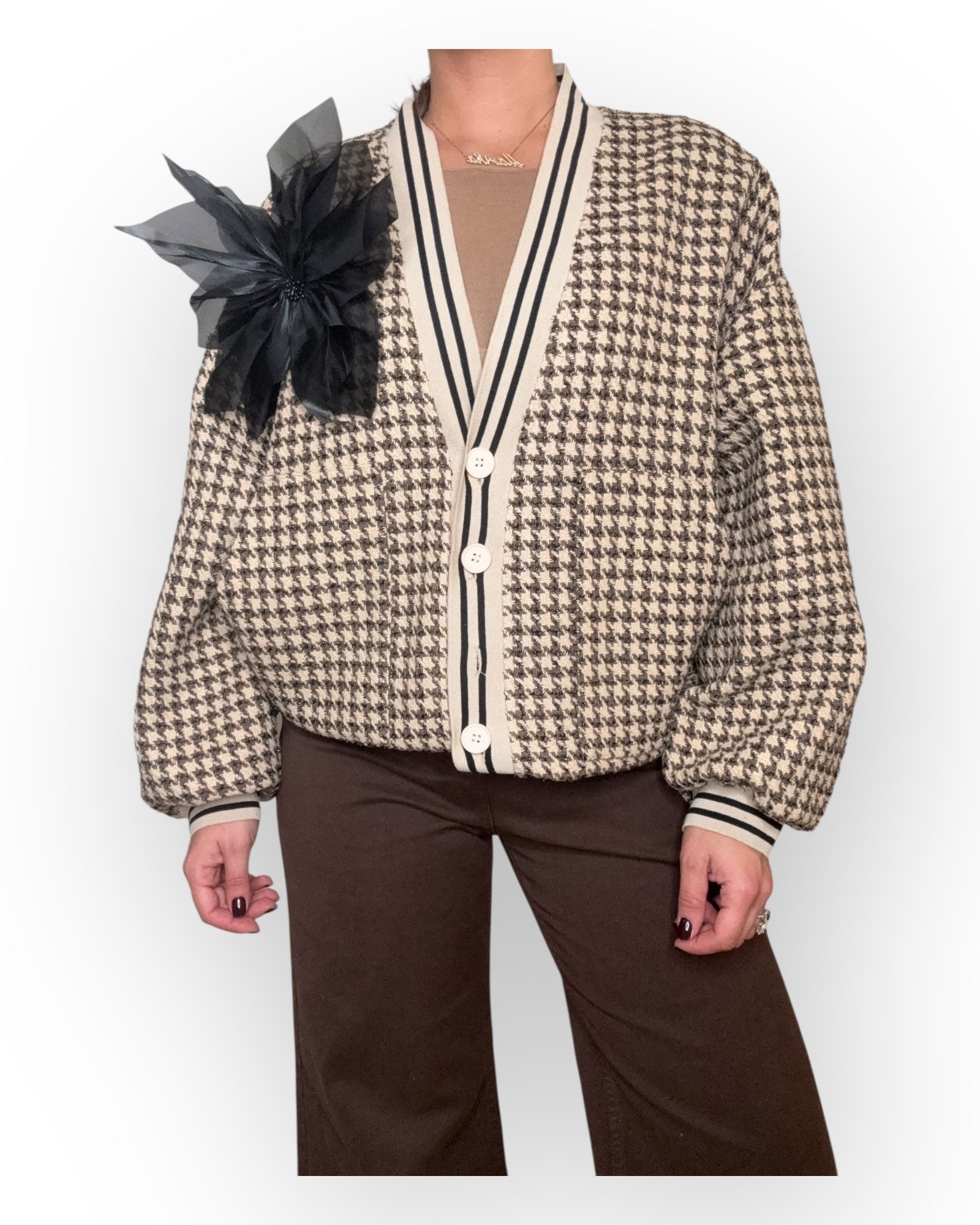 CARDIGAN CON BOTTONI E SPILLA A FIORE.
