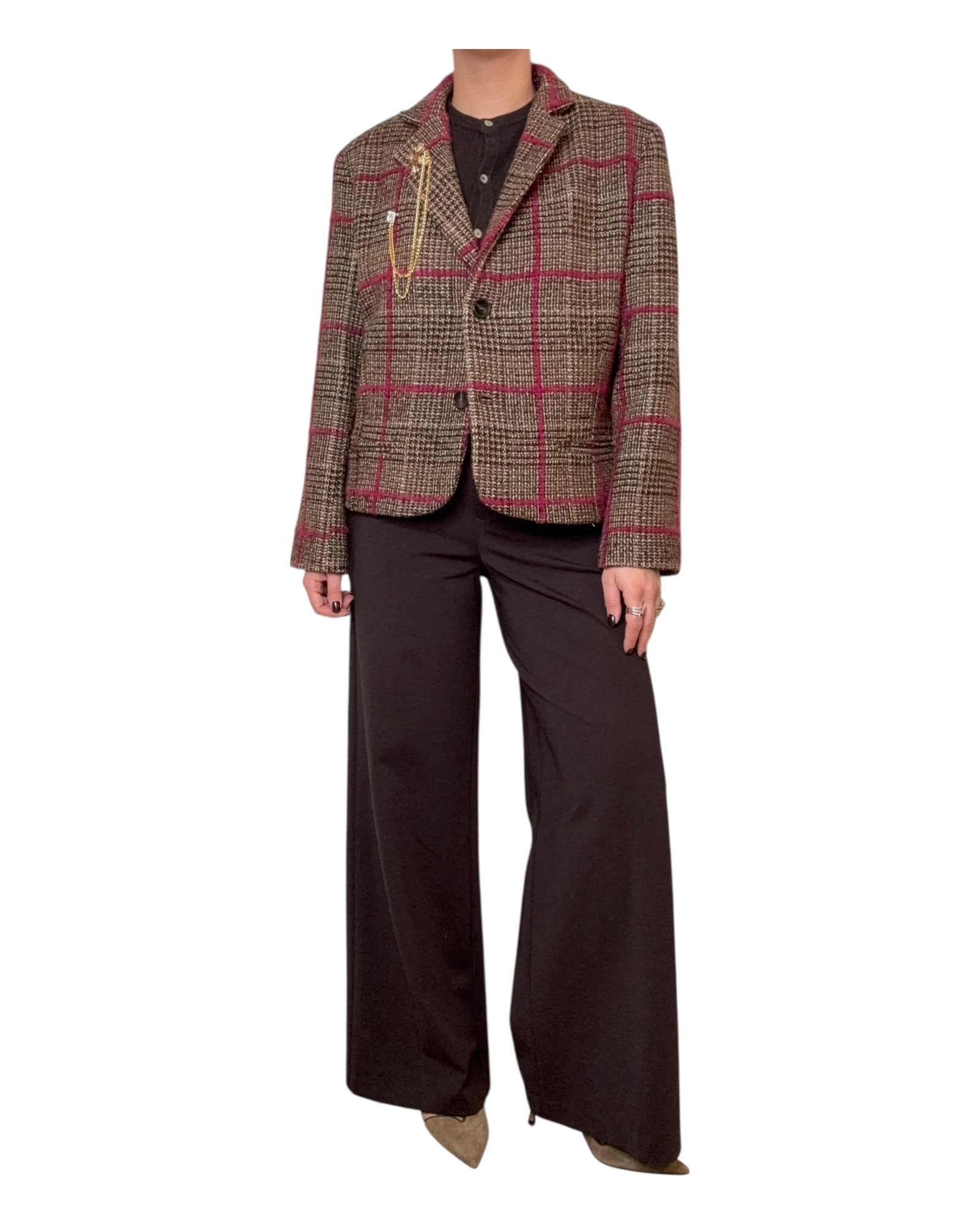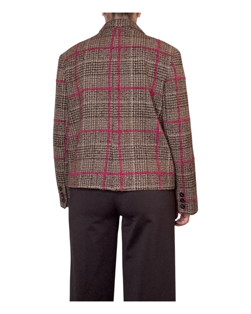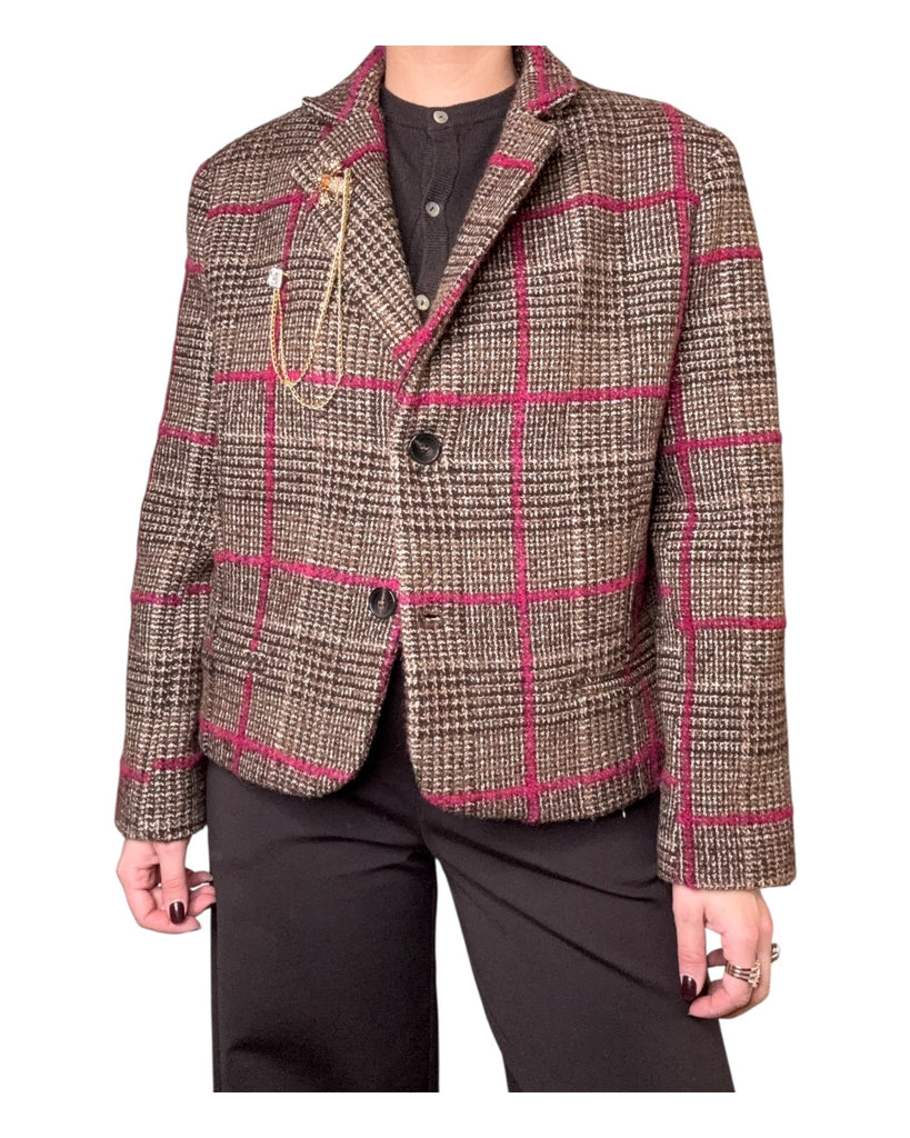 Giacca corta dal taglio strutturato con fantasia a quadri, arricchita da una spilla decorativa a catena. Spalline leggermente imbottite, chiusura a due bottoni, fodera interna e spacchetto posteriore. Le tasche frontali finte colore tabacco/fucsia