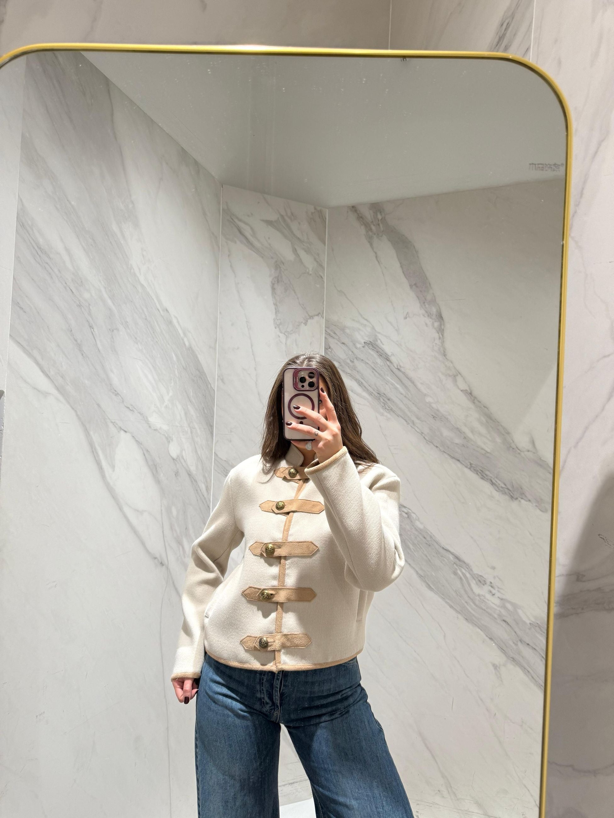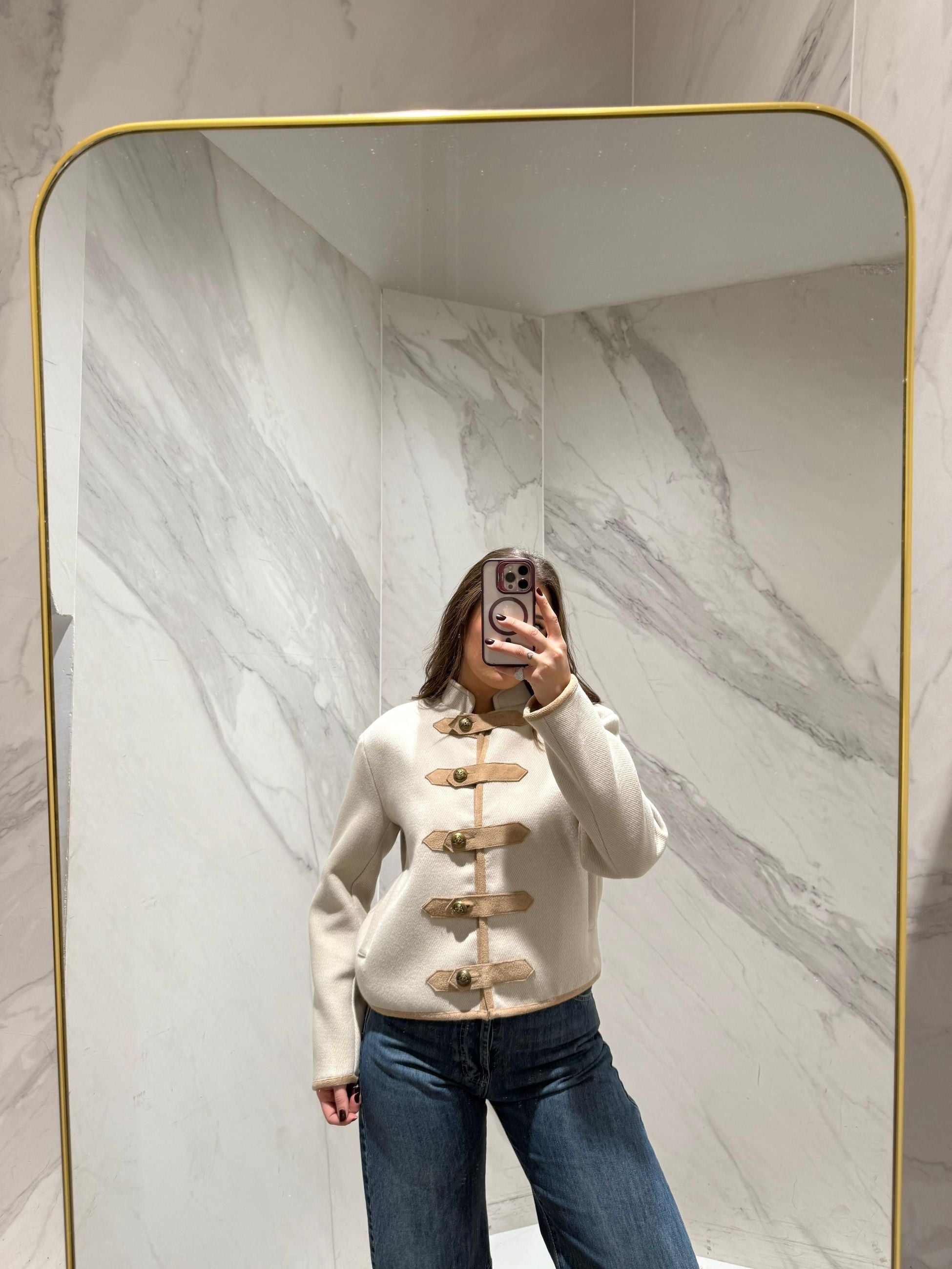 GIACCA CON SPALLINE E ALAMARI E BOTTONI DORATI.