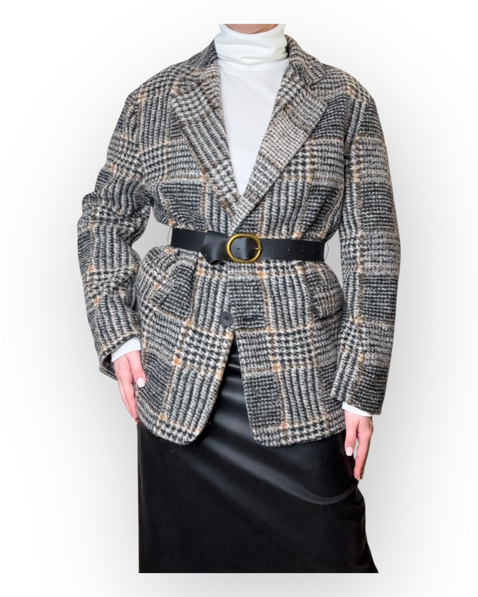 Giacca cappotto , fantasia principe di Galles , con cintura in vita.