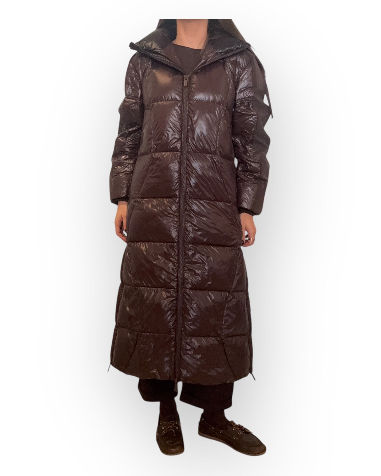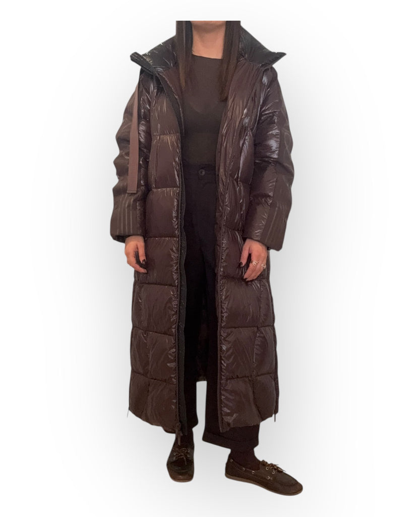 PIUMINO LUNGO LUCIDO CON RIPORTI NELLA MANICA E CAPPUCCIO E CERNIERE NEL LATERALE.
