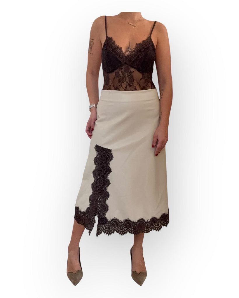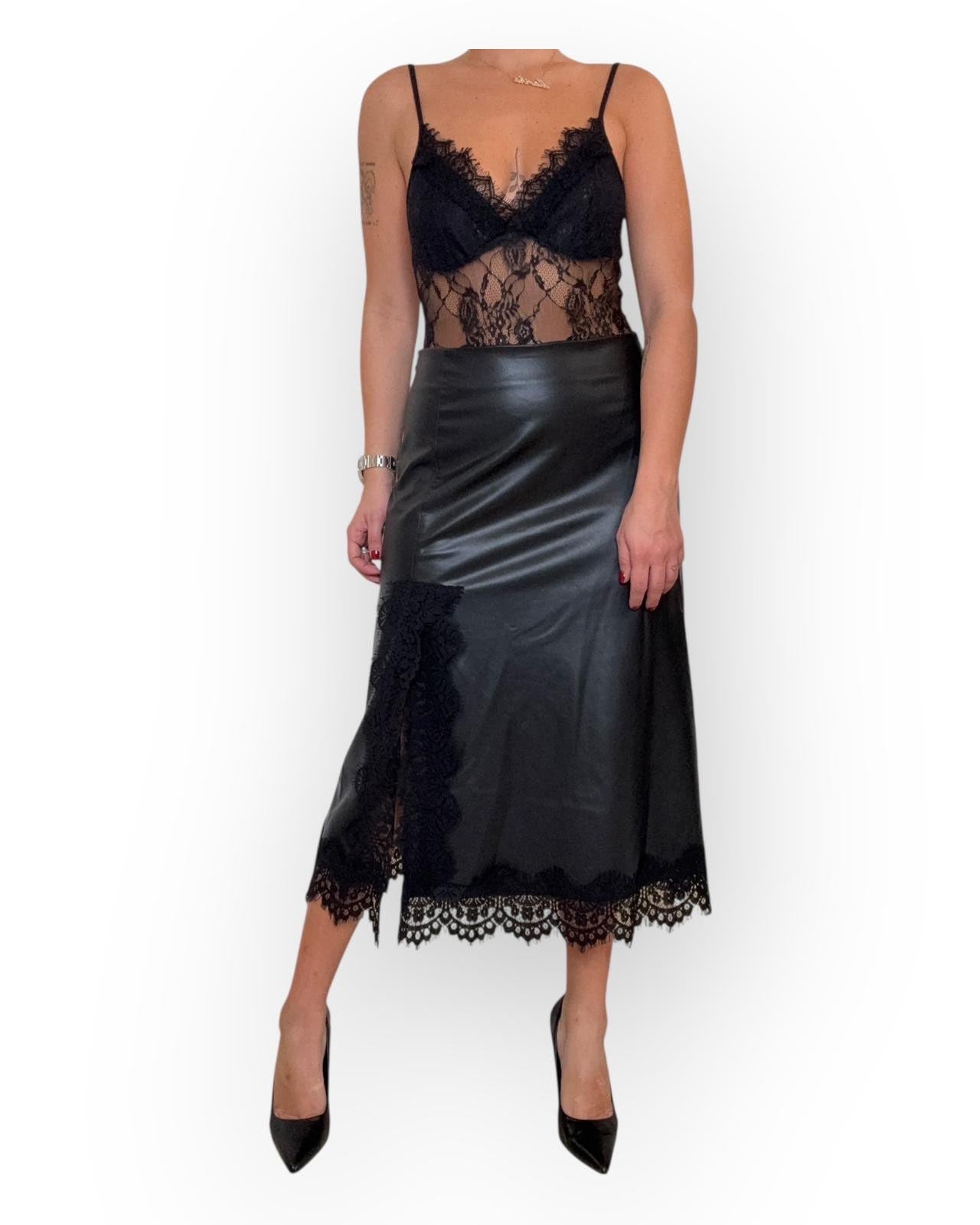 GONNA MIDI IN ECOPELLE CON SPACCO LATERALE E DETTAGLI IN PIZZO.