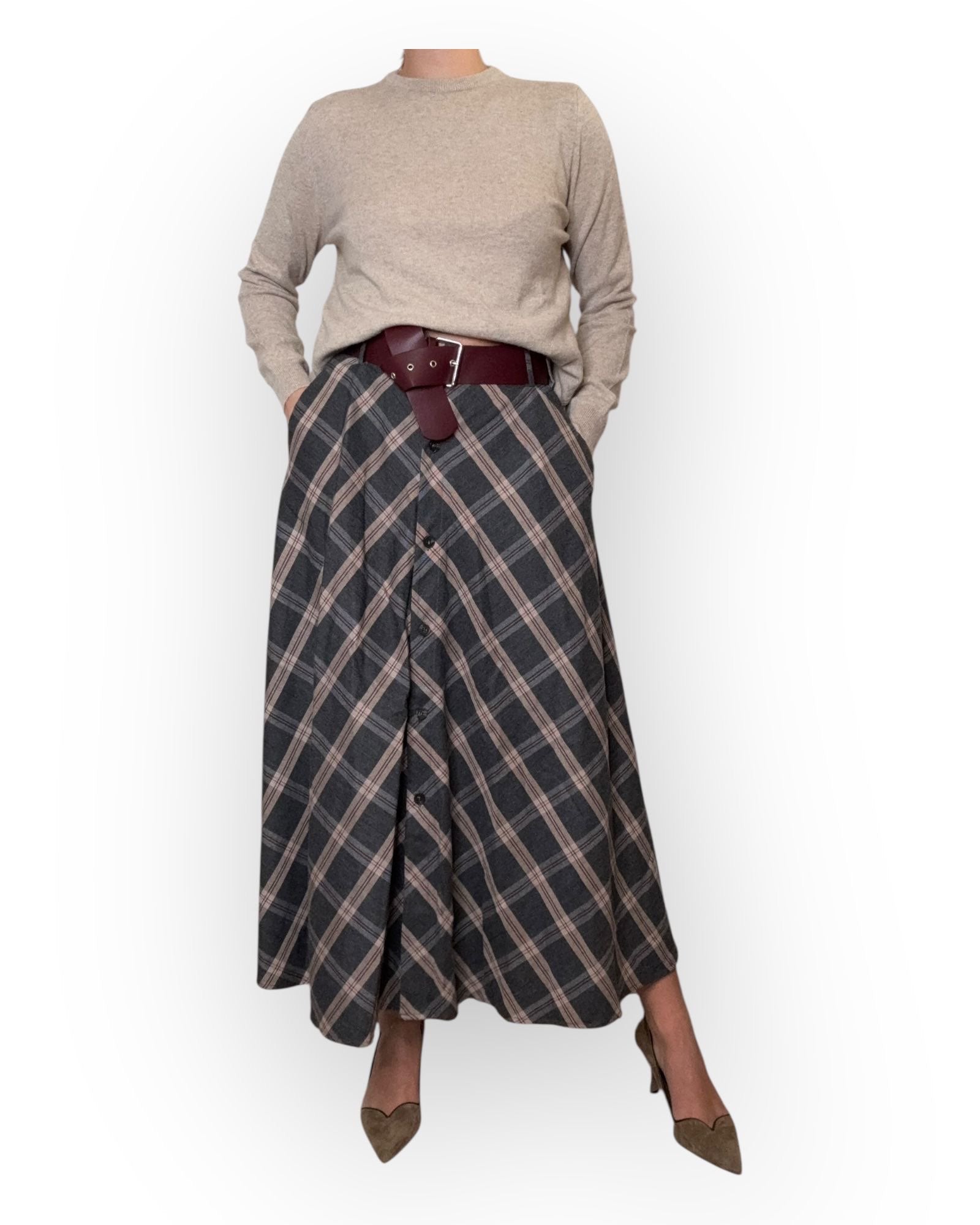 Gonna lunga fantasia check con bottoni sul davanti.