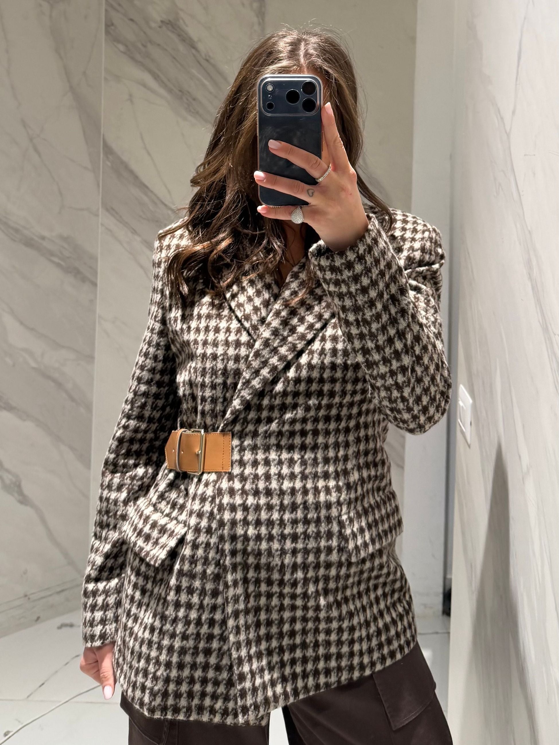 Giacca cappotto pied de poule con chiusura cintura laterale