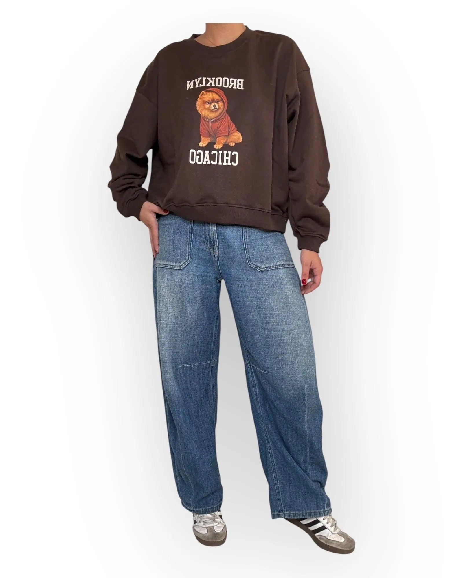 FELPA CON STAMPA DI SPITZ DI POMERANIA NANO.CON SCRITTA "BROOKLYN" "CHICAGO"