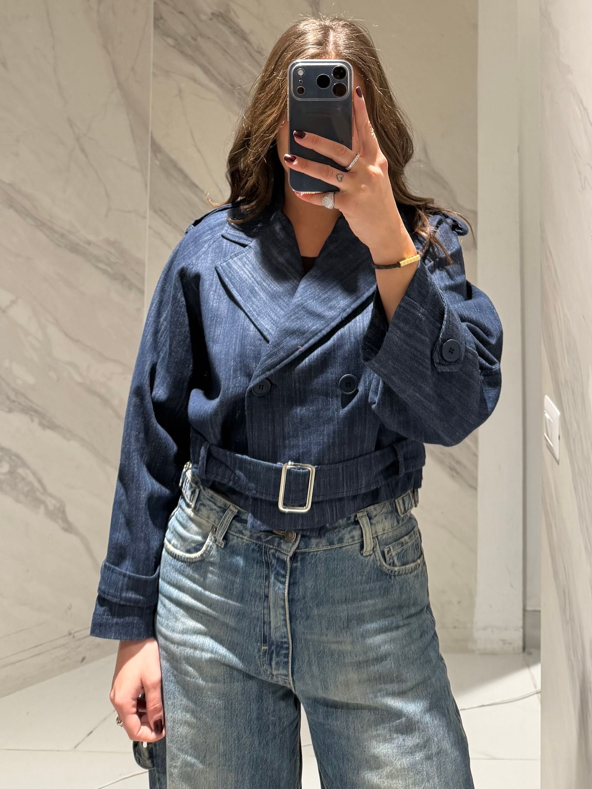 GIACCA CORTA DOPPIOPETTO IN DENIM CON CINTURA IN VITA.