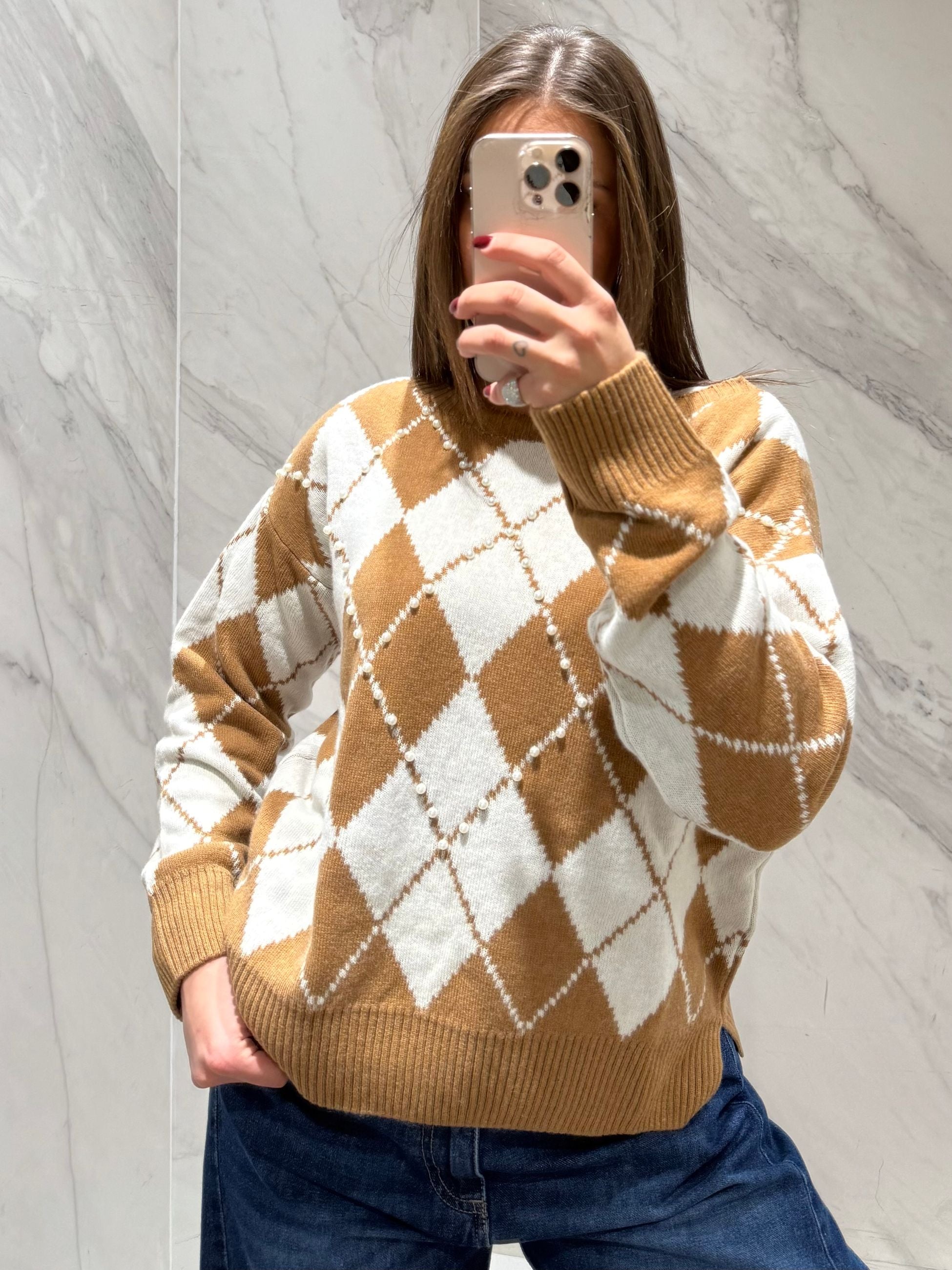 MAGLIONCINO A BARCA CON FANTASIA A ROMBI CON PERLINE IN RILIEVO.