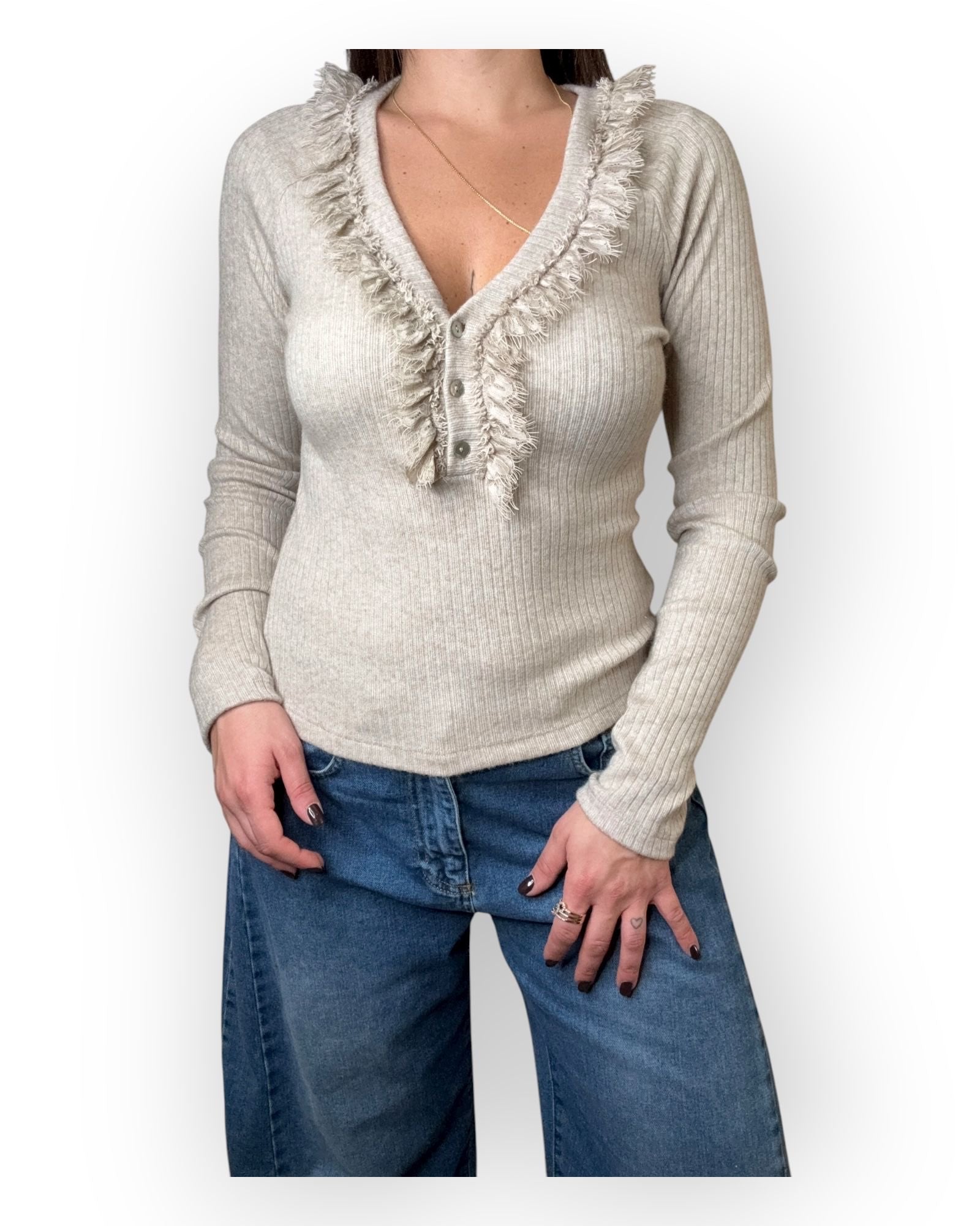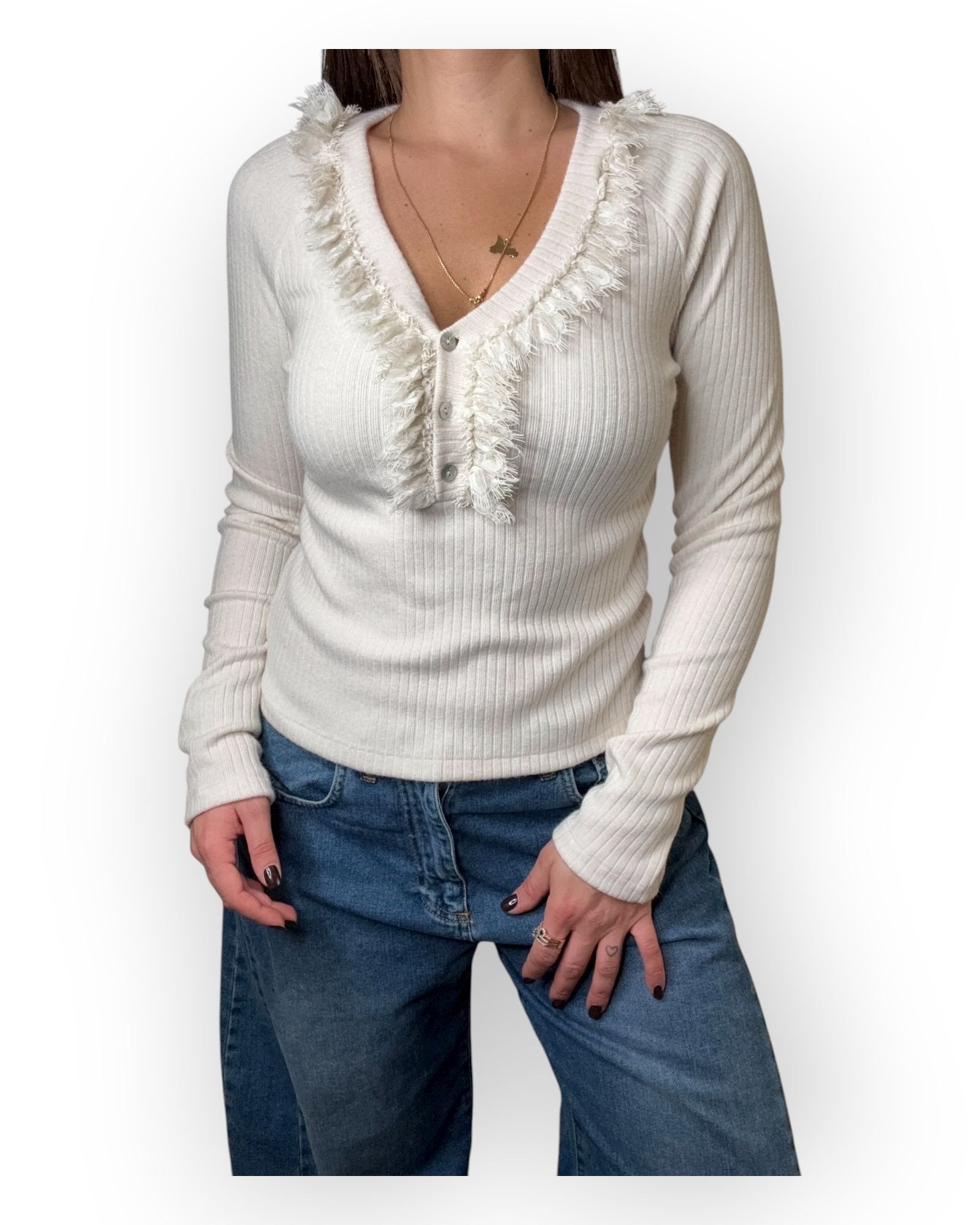 Maglia costina con pizzo davanti e bottoni