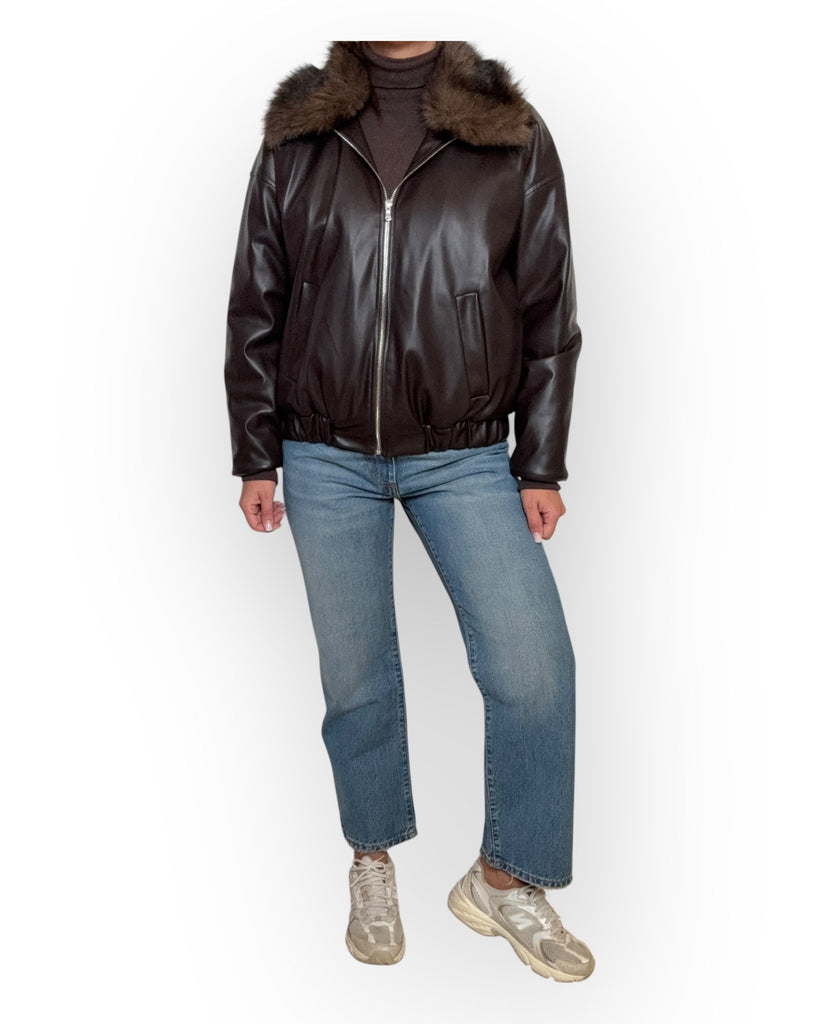 Bomber ecopelle interno trapuntato , chiusura zip ,modello over con ecopelliccia al collo removibile