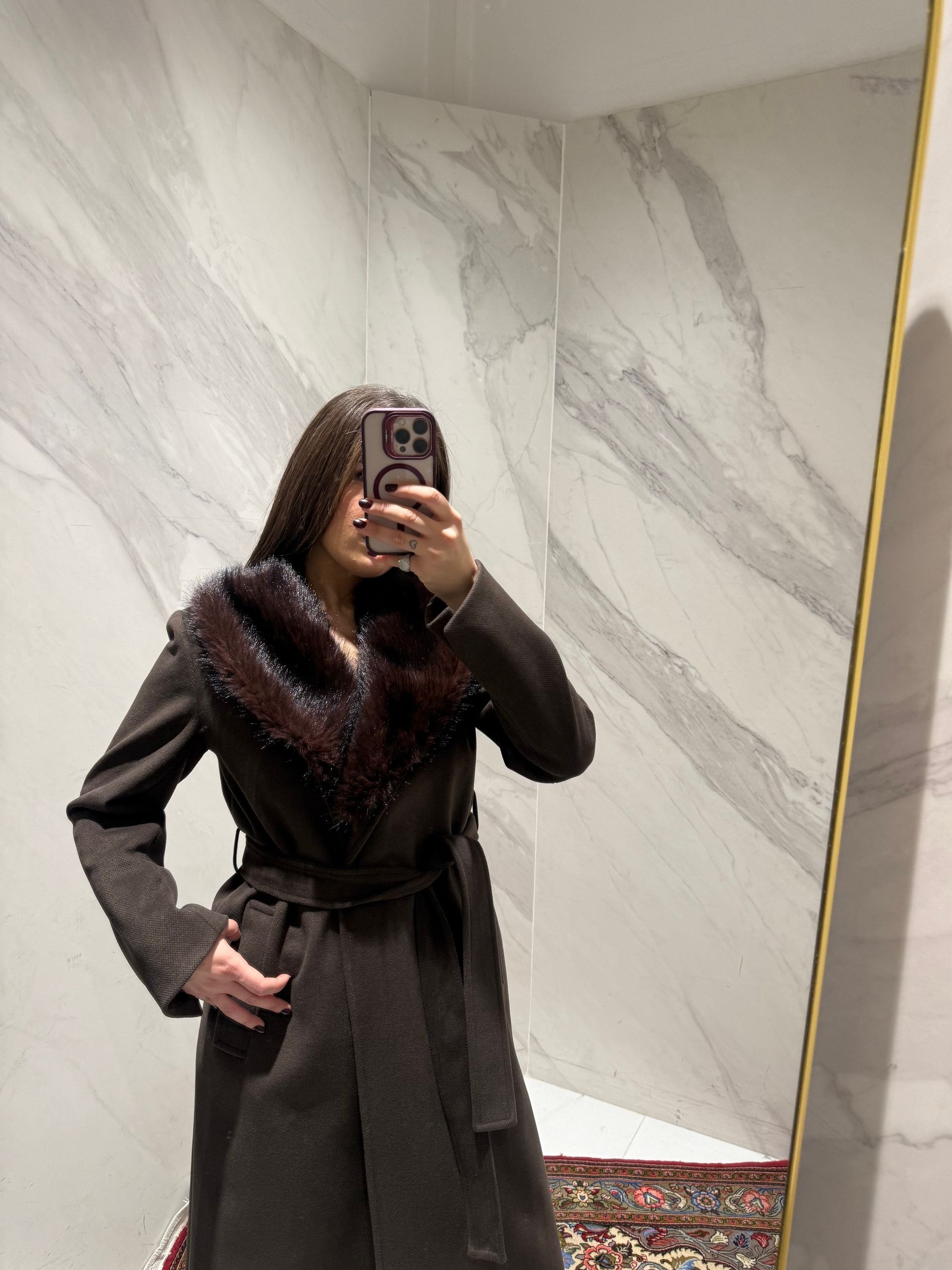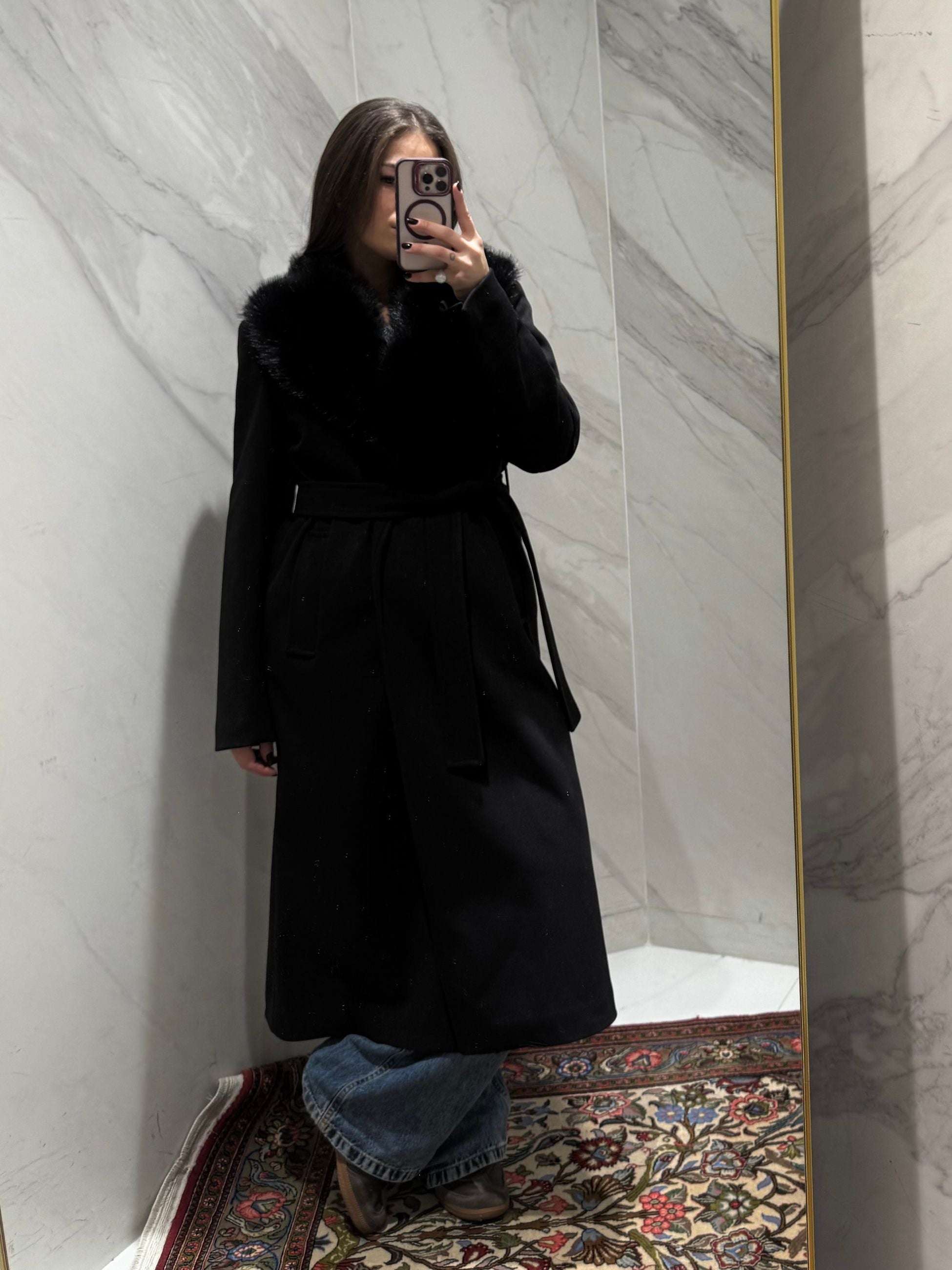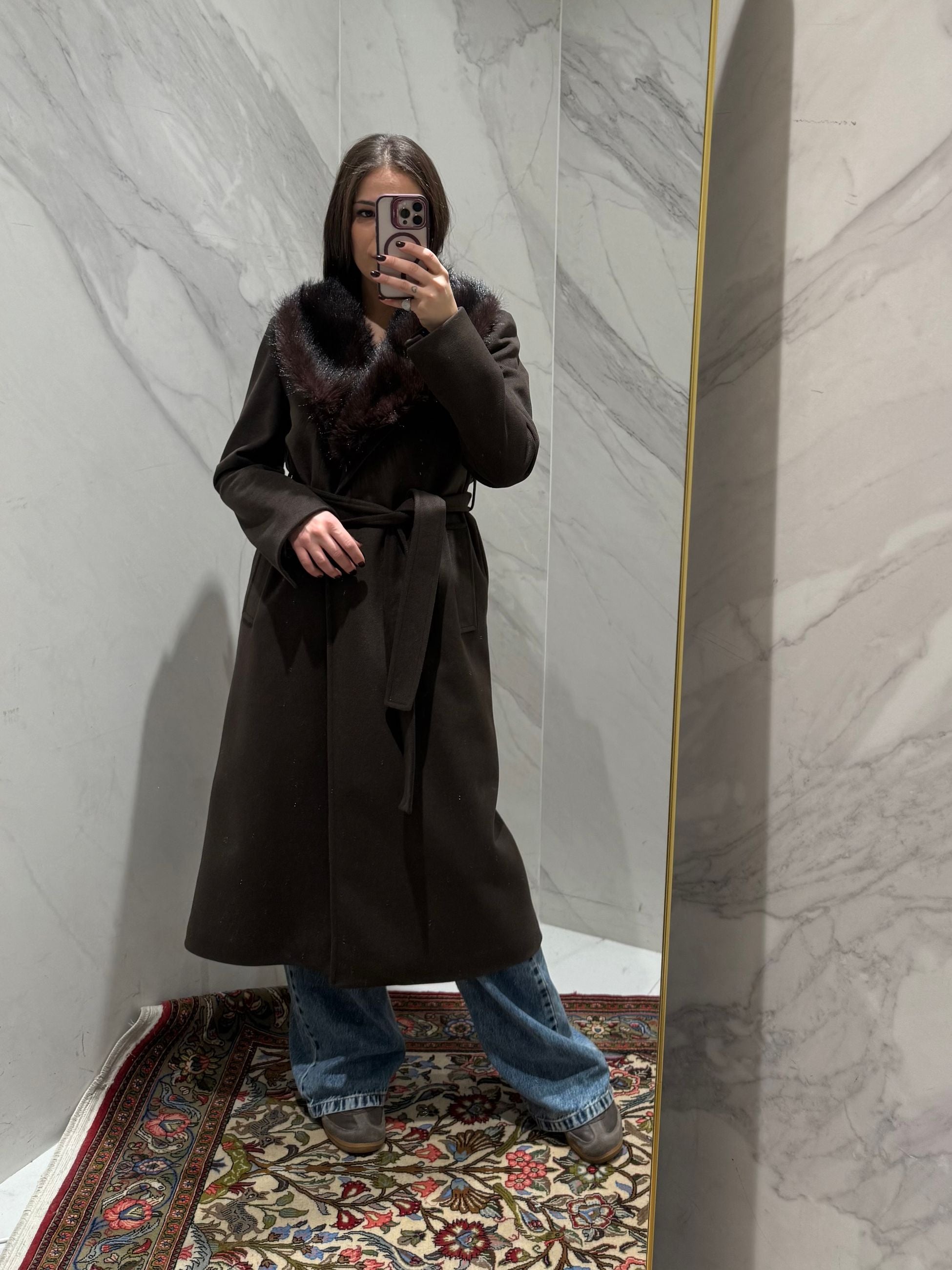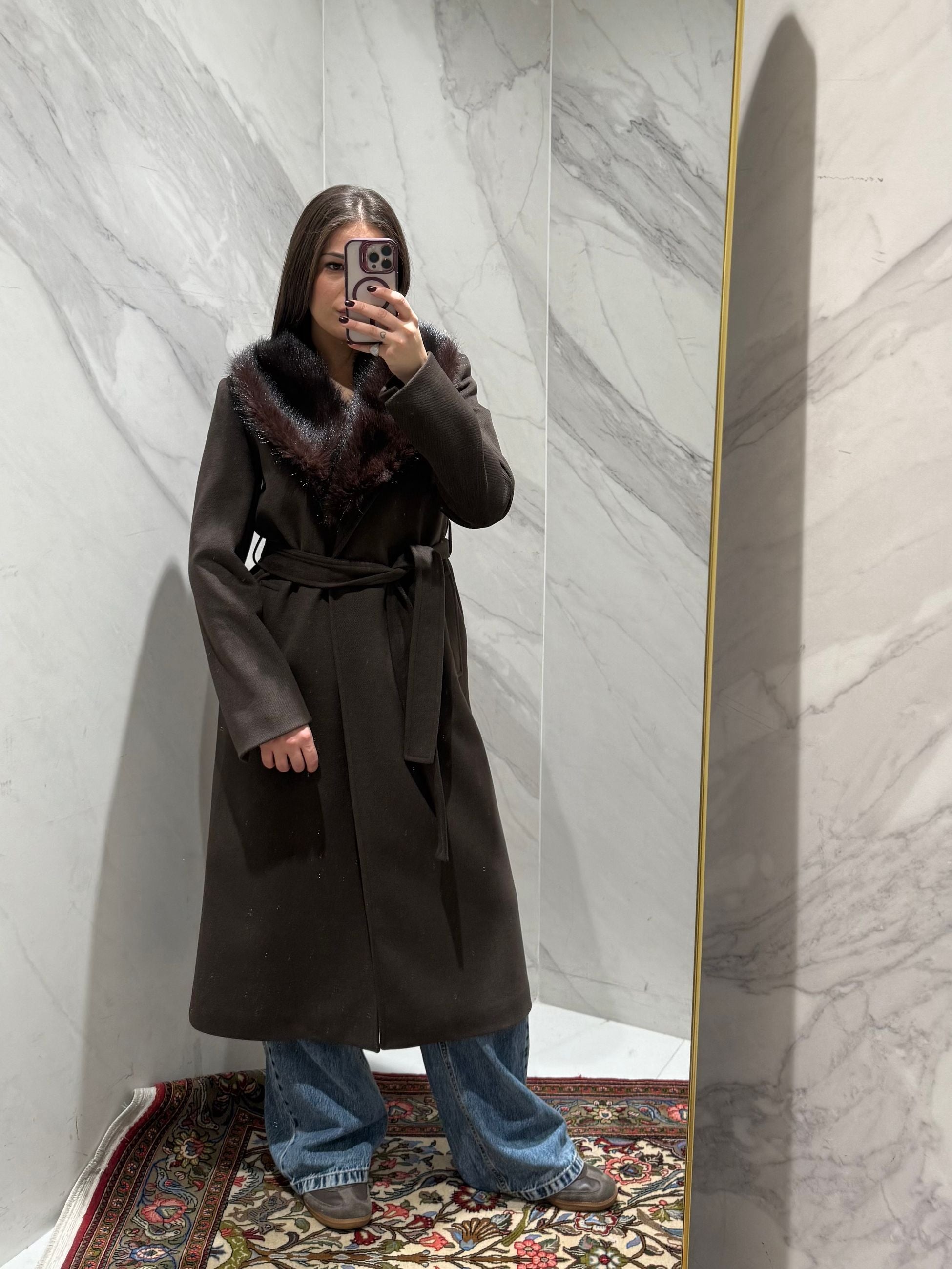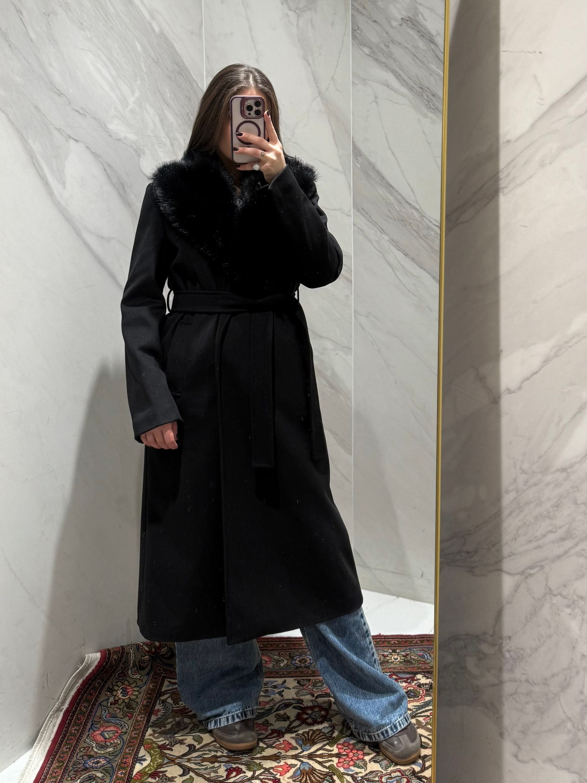 CAPPOTTO LUNGO CON COLLO IN ECOPELLICCIA, CON CINTURA IN VITA.