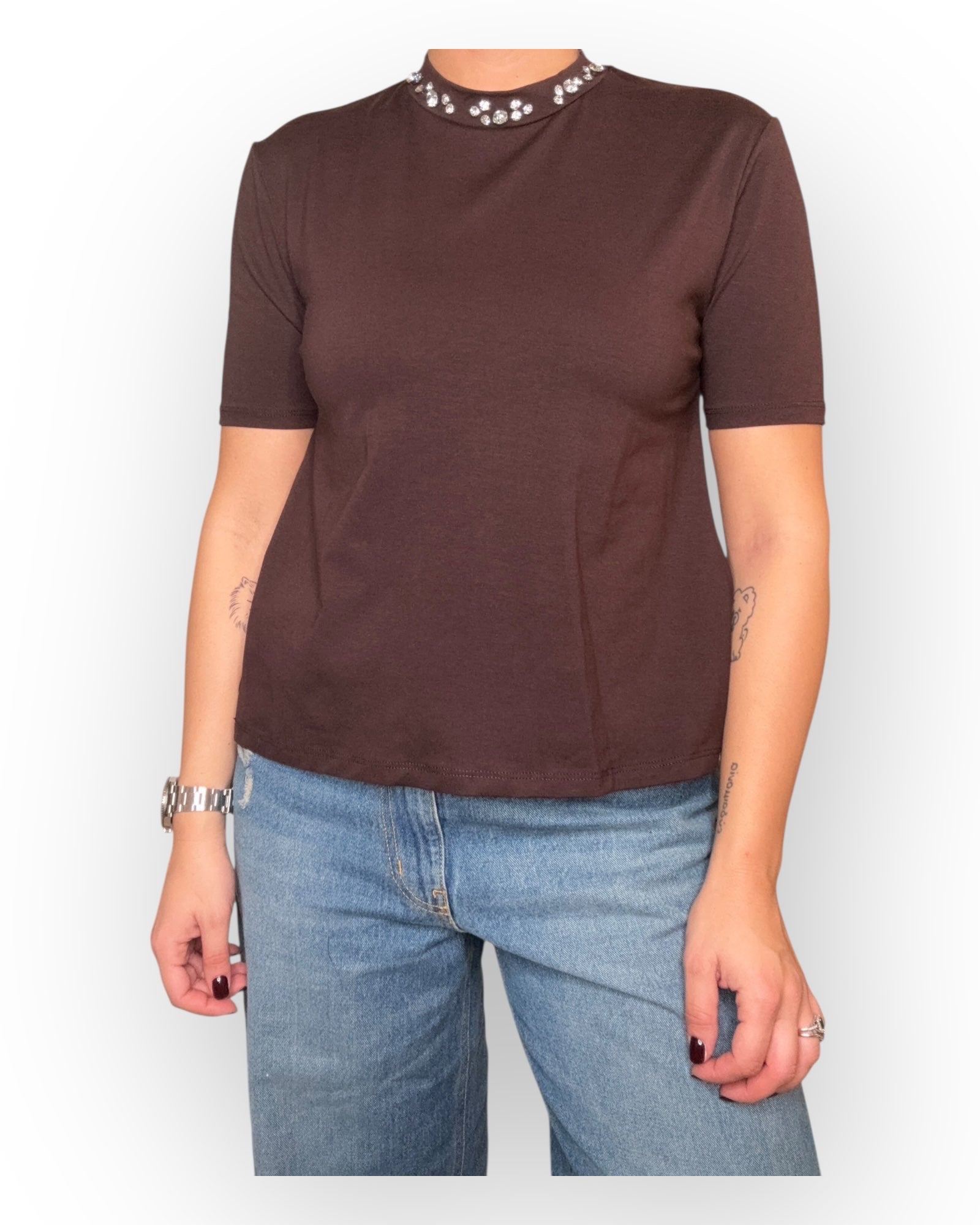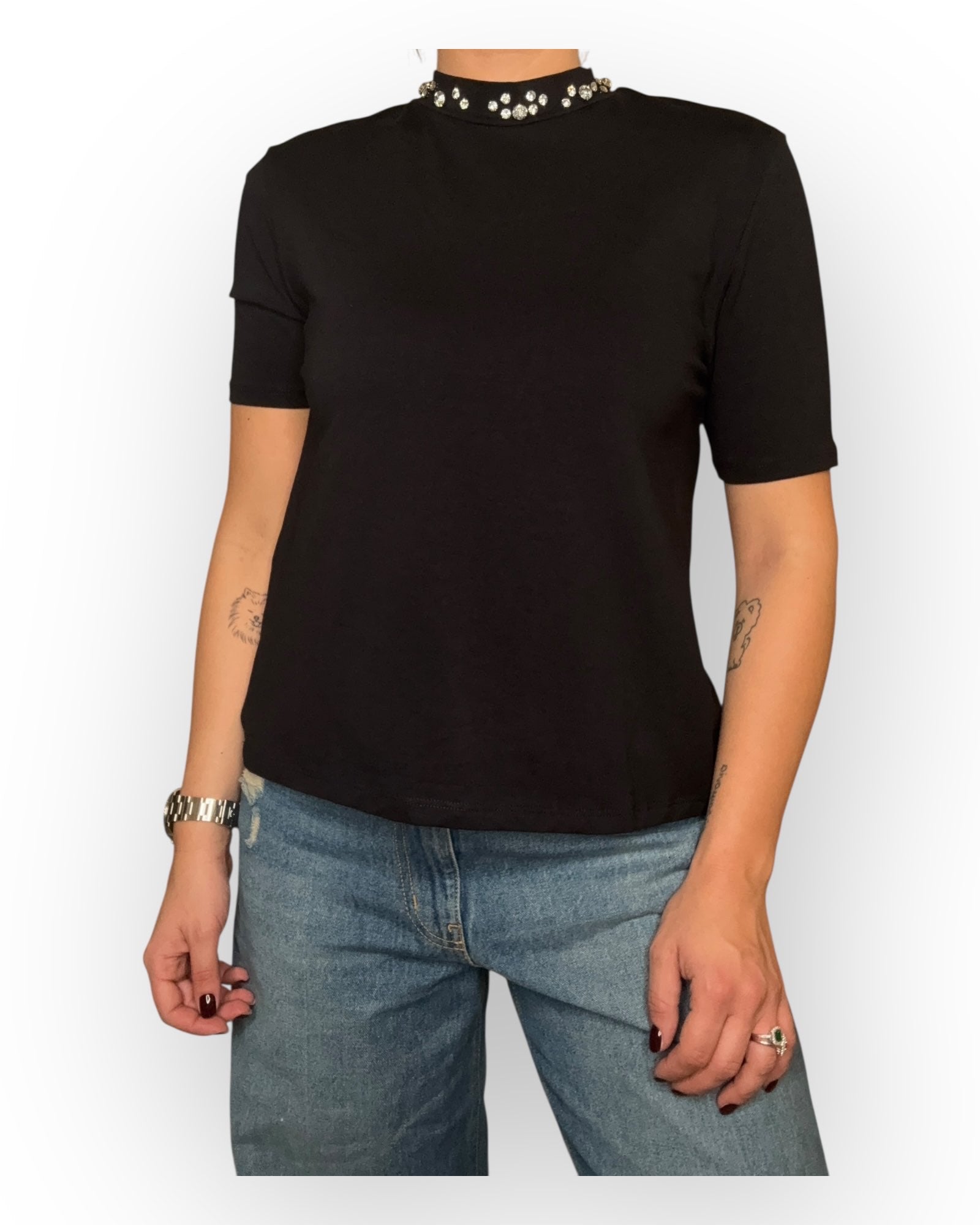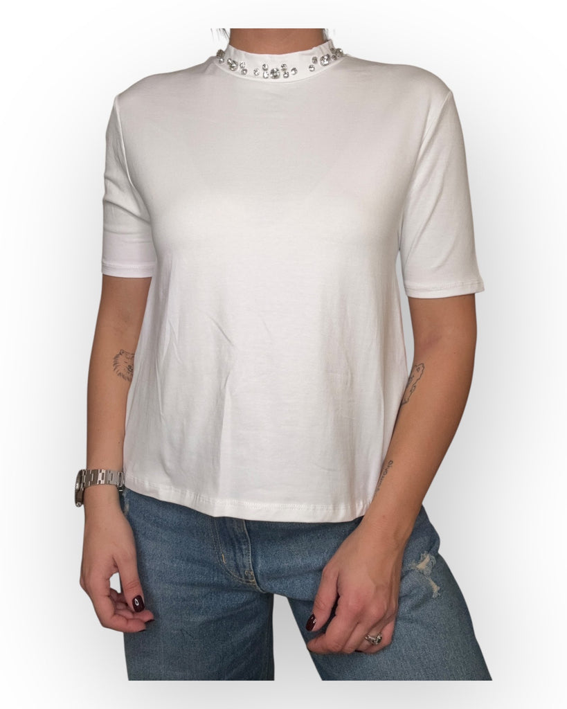 T-SHIRT BASICA CON STRASS SUL COLLETTO.