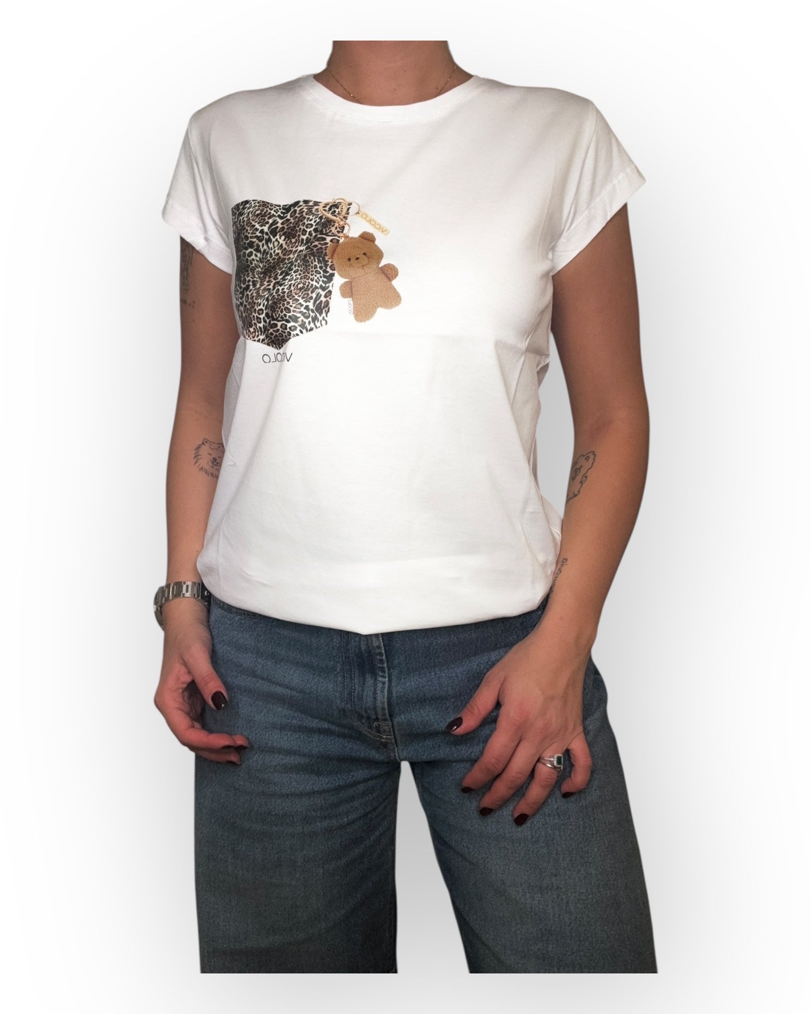 T-SHIRT CON FINTO TASCHINO MACULATO , E PORTACHIAVI CON ORSETTO