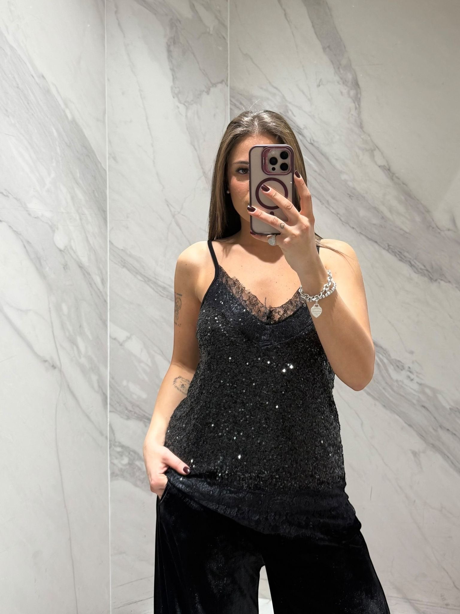 CANOTTA LE STREGHE IN PAILETTES CON BORDO IN PIZZO