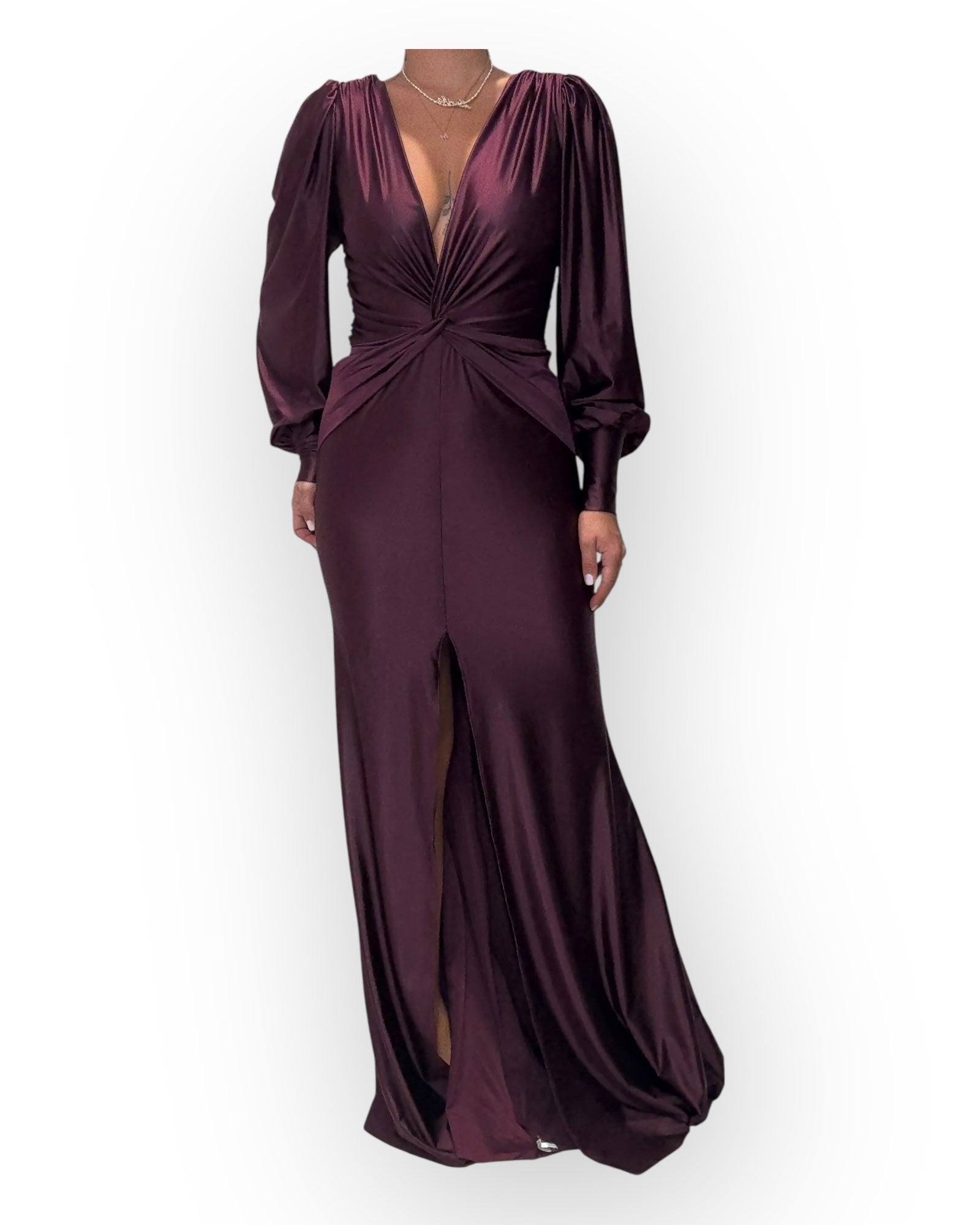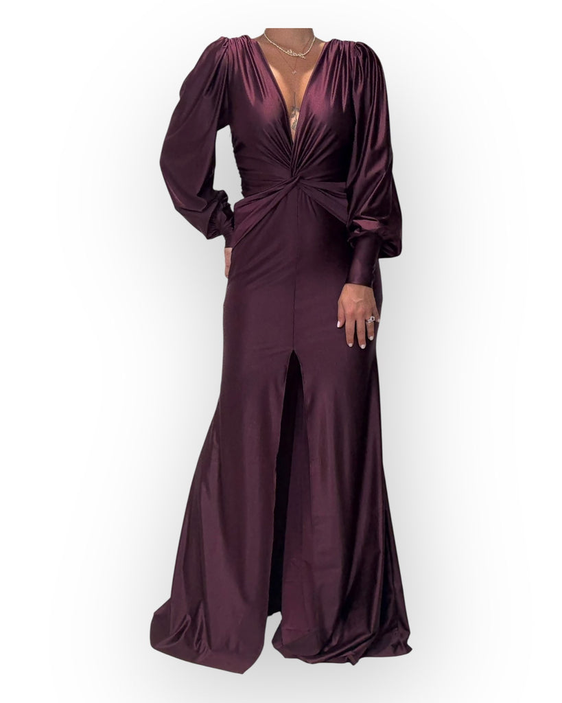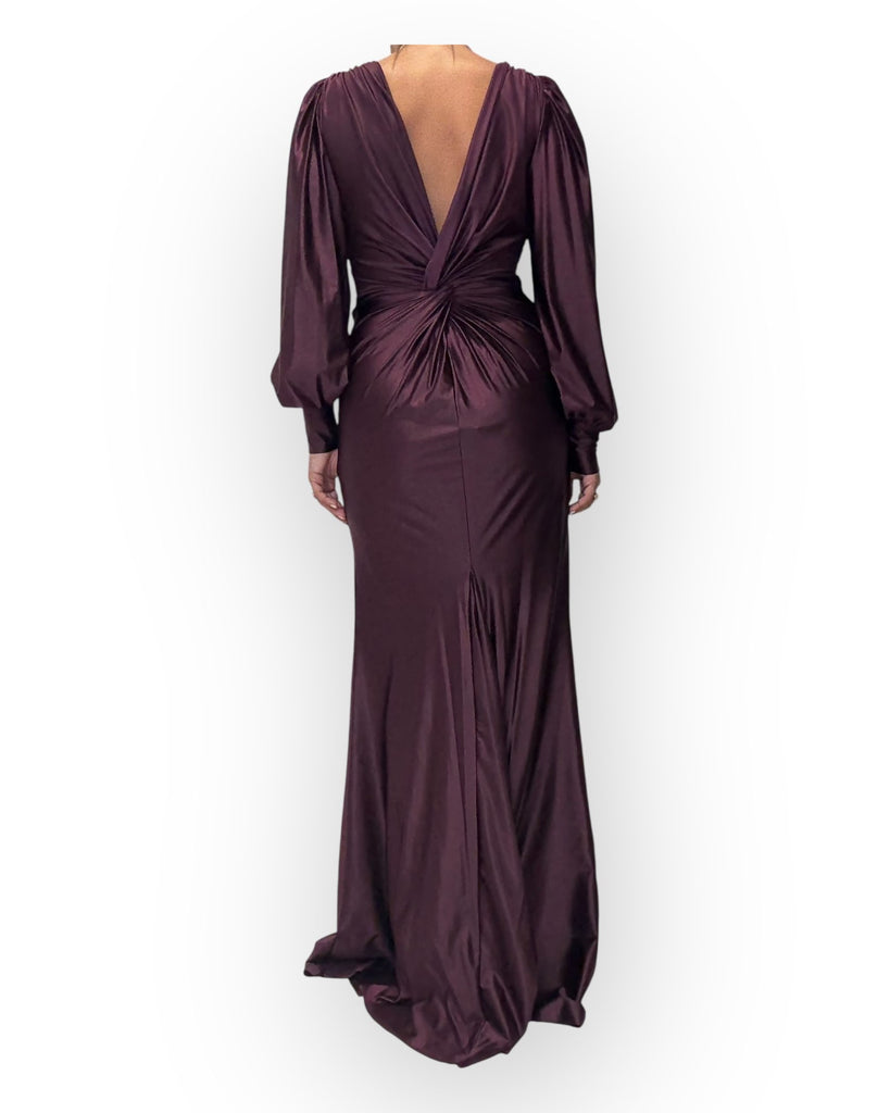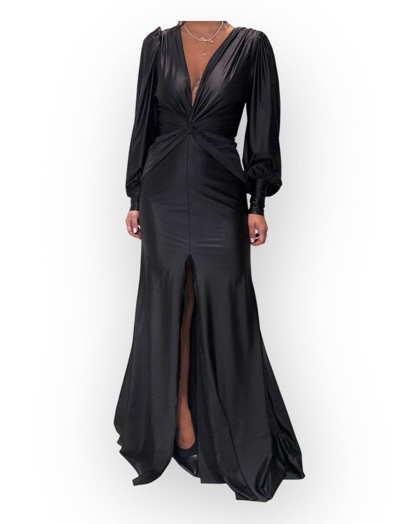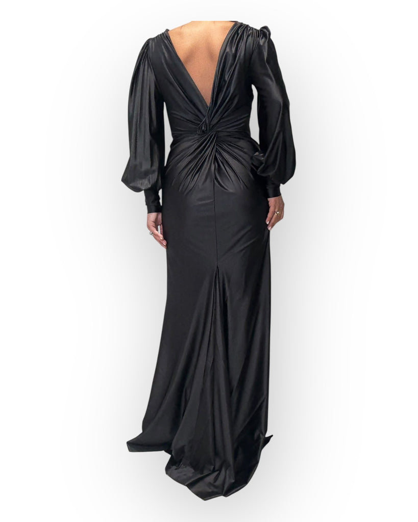 ABITO CON MANICA LUNGA, CON SCOLLATURA "V" SUL DAVANTI, DRAPPEGIATO.
