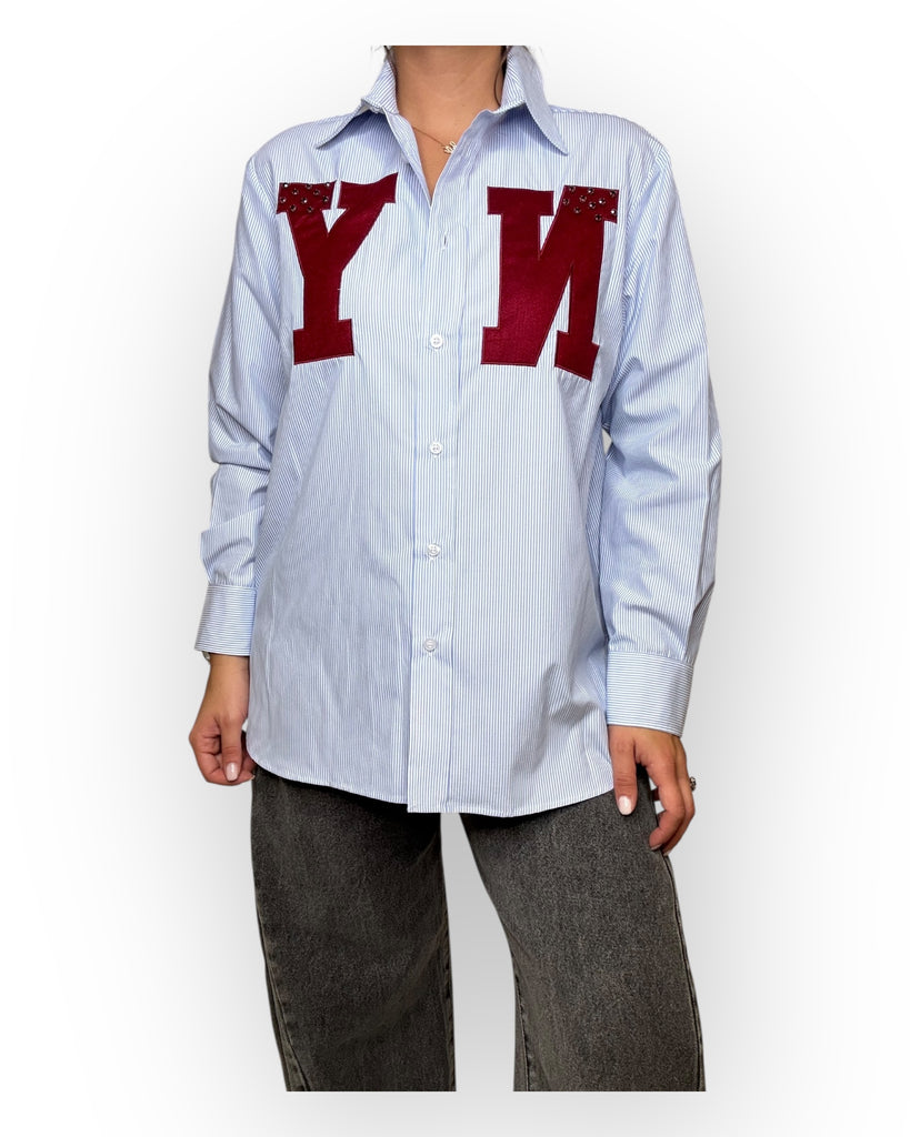 CAMICIA A RIGHE CON PATCH SUL DAVANTI E STRASS