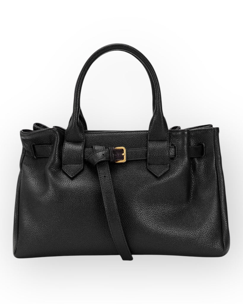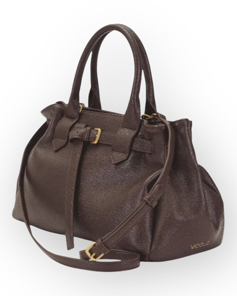 Borsa Journey Bag Small in ecopelle martellata. Manici rigidi in similpelle. Chiusura con cerniera. Dettaglio cintura passante con fibbia con chiusura regolabile. Finiture anticate color oro. Tracolla in similpelle con fibbia regolabile con gancio in metallo removibile. Tasca interna con cerniera e taschina piatta. Logo vicolo lettering impresso a caldo sul lato borsa.