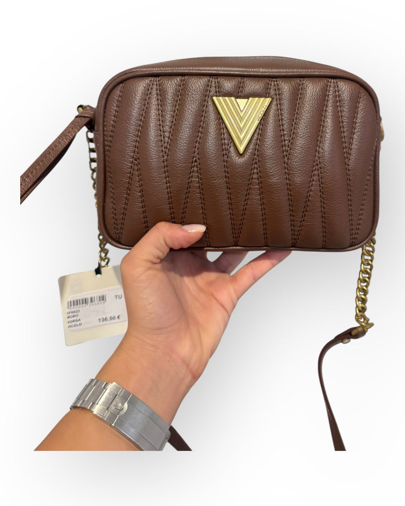 BORSA IN PELLE CON LOGO DORATO CON IMPUNTURE SUL DAVANTI E SUL RETRO, CON TRACOLLA CON CATENA E PELLE.