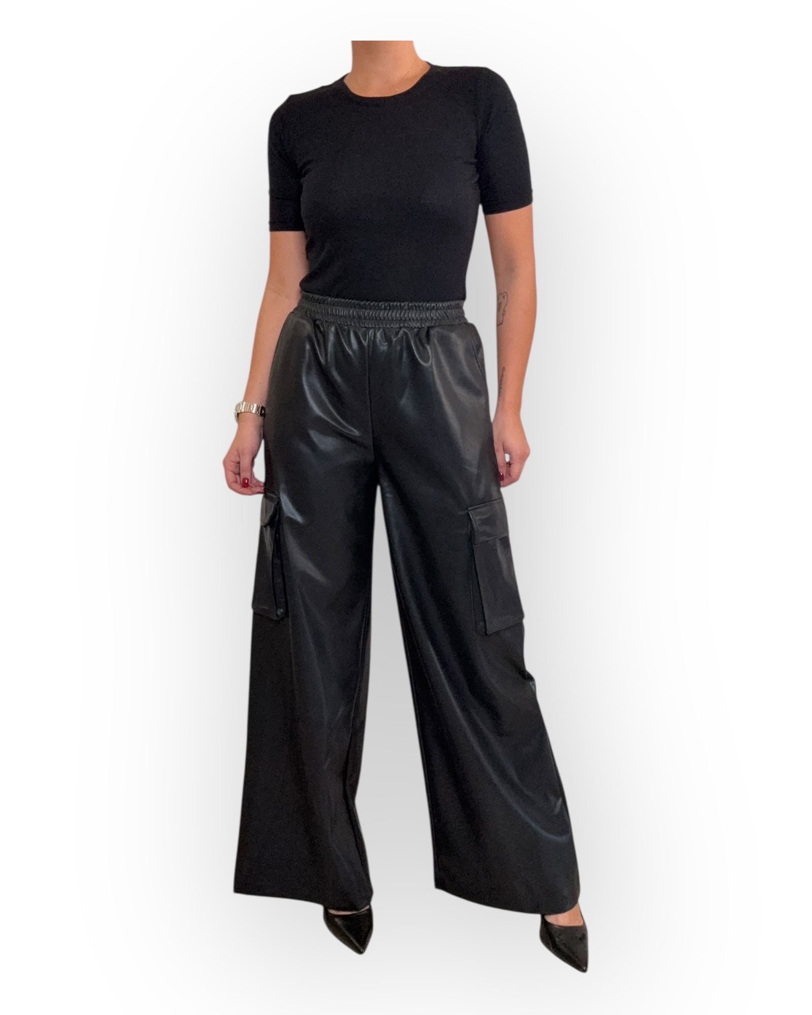 PANTALONE CARGO IN ECOPELLE CON MOLLA IN VITA.