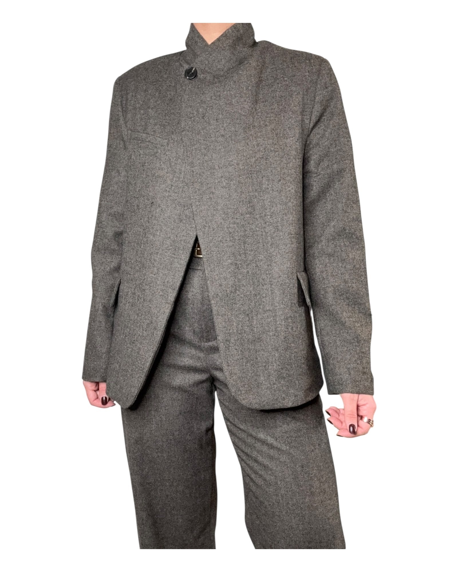 Giacca mantella spigata con chiusura bottone al collo ,tasche frontali funzionali, taschino finto e spacco posteriore